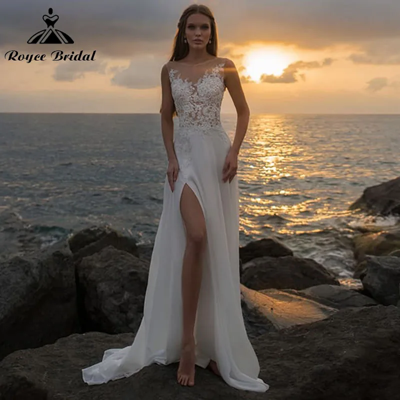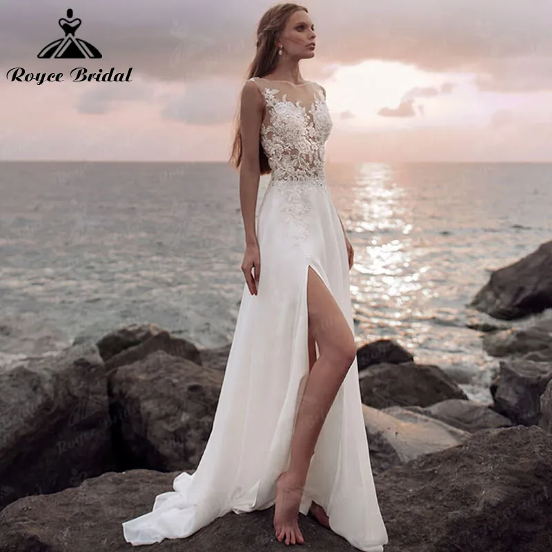 ТРАПЕЦИЕВИДНОЕ пляжное свадебное платье в стиле бохо с пуговицами сзади, разрезом сбоку, без рукавов, приблизительное шифоновое платье с круглым вырезом 2022