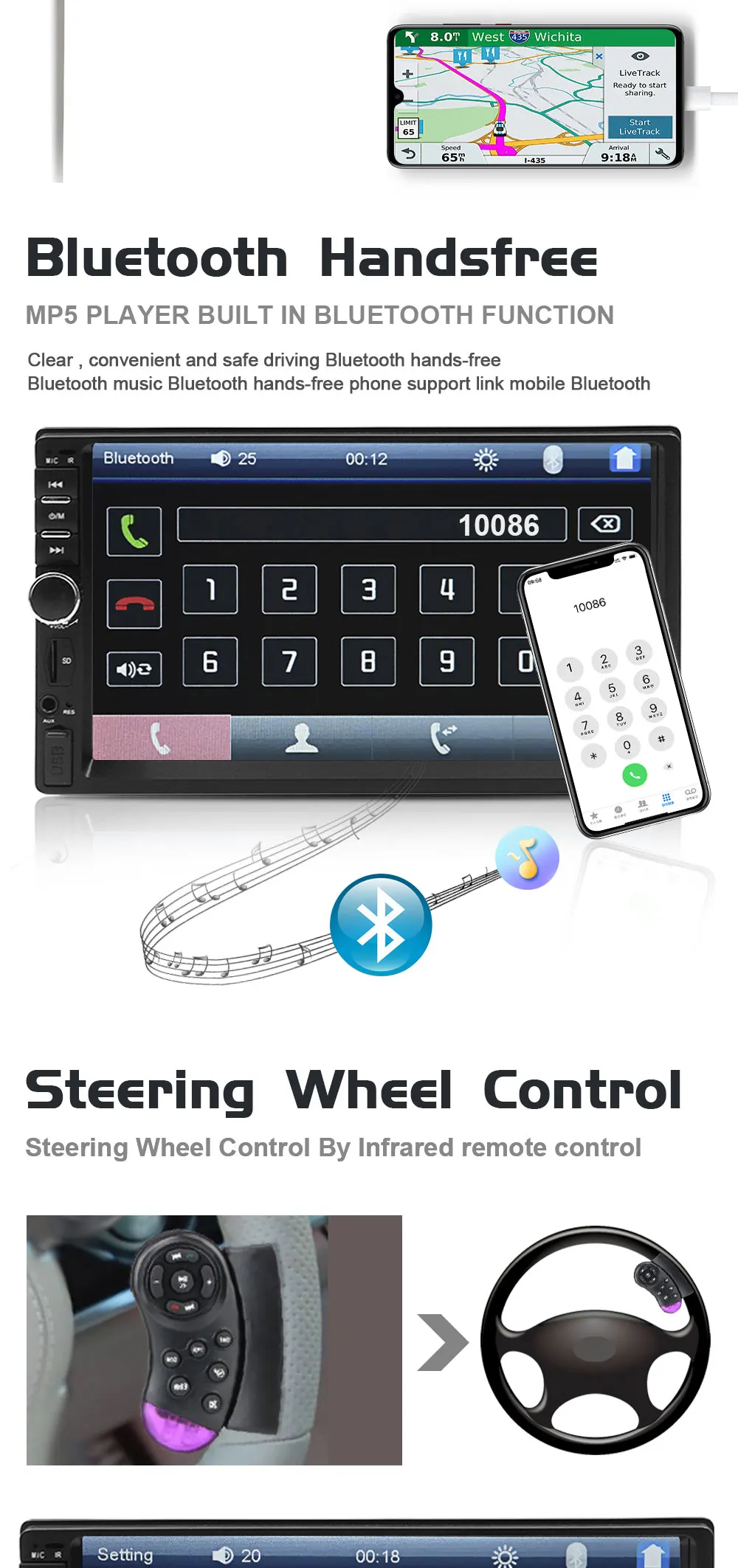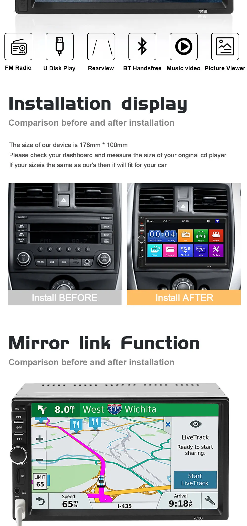 1. Емкостная сенсорная панель с 7 дюймовым HD монитором под управлением светодиодный панель 800*480 пикселей(Тип кнопки резистивный сенсорный, тип сенсорного ключа емкостный сенсорный)2. Новейшие чипы поддерживают функцию зеркальной связи IOS и androidСистема IOS поддерживает 12.3.1 vision. Но не поддерживает IPHONE X выше vision3. Логотип автомобиля экран логотип доступен-заводская установка4. Встроенная функция bluetooth, поддержка телефонных звонков и воспроизведения музыки5. Встроенная функция FM.6. Один видео вход и один видео вход камеры заднего вида7. Входной порт AUX, функция регулировки эквалайзера8. Два видео выхода функция поделиться экраном с 2 экраном автомобиля9. Одна функция аудиовыхода (разъем RCA) и 4 выхода динамика10. Встроенный USB ,TF карта solt, поддержка полноформатного файла и 1080P Кино11. Поддержка RMVB / RM / FLV / 3GP / MPEG / DVIX / XVID / DTA / VOB / AVI Формат видеофайлов12. Поддержка формата аудио файлов MP3 / WMA / WMV / OGG / APE / ACC / FLAC.13. Поддержка форматов изображений JPEG / BMP / GIF / TIF14,2 din mp5 Размер корпуса: 178*140*100 мм15. Выходная мощность аудио: 4x50 ВтИсточник питания: DC12V16. Поддержка входного сигнала камеры, Рулевое управление