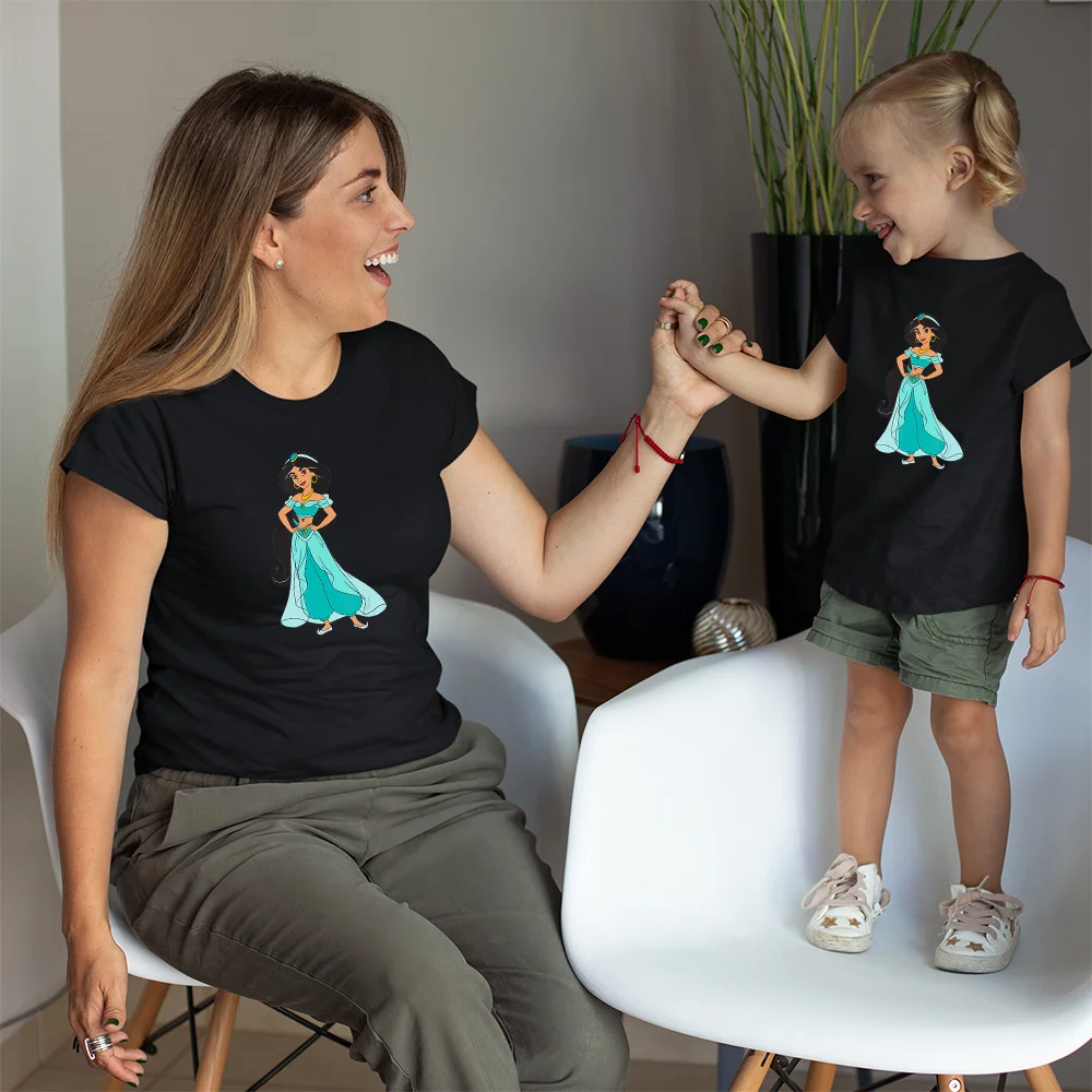 Одежда для мамы и дочки с рисунком Принцессы Диснея жасмина модный топ летний Повседневный пуловер Футболка для девочек Черная Женская футболка
