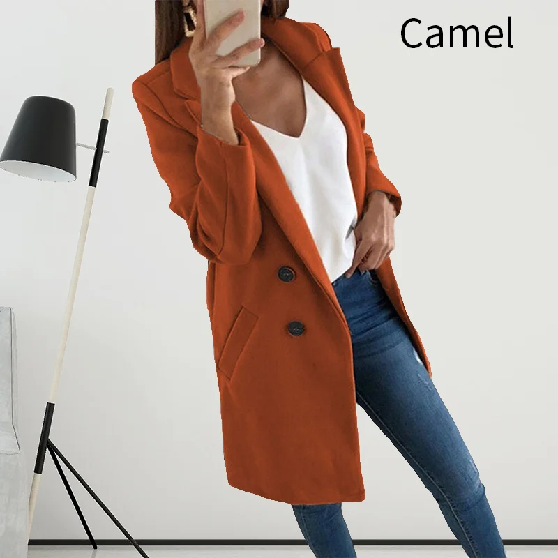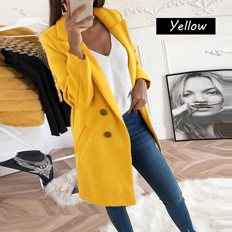 Женское двубортное пальто, зимнее модное Однотонное шерстяное пальто с отложным воротником, повседневное офисное длинное пальто с карманами и длинным рукавом