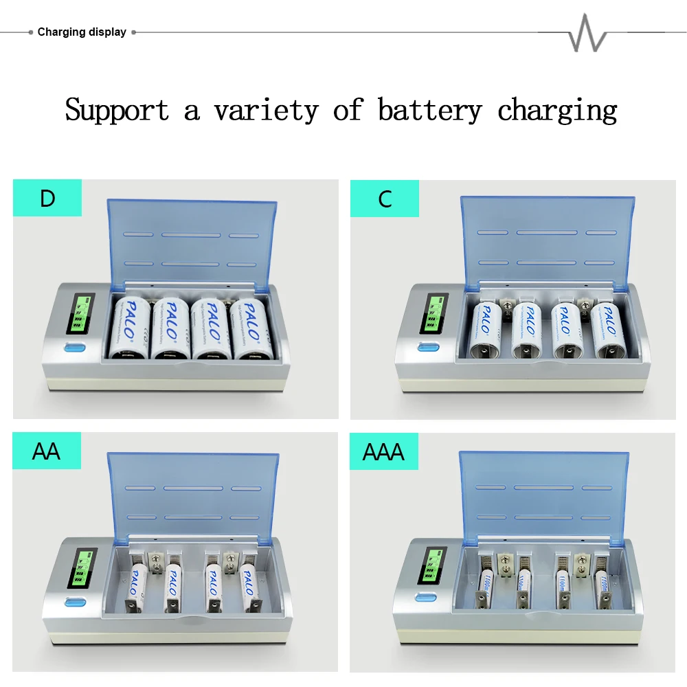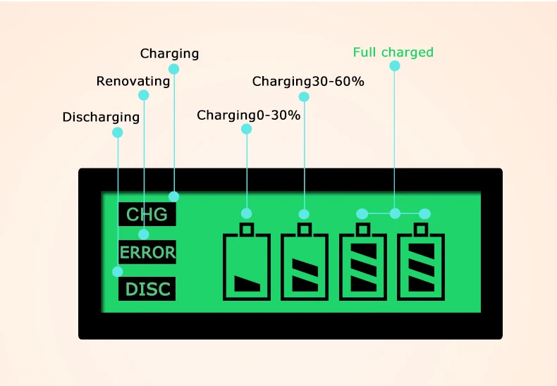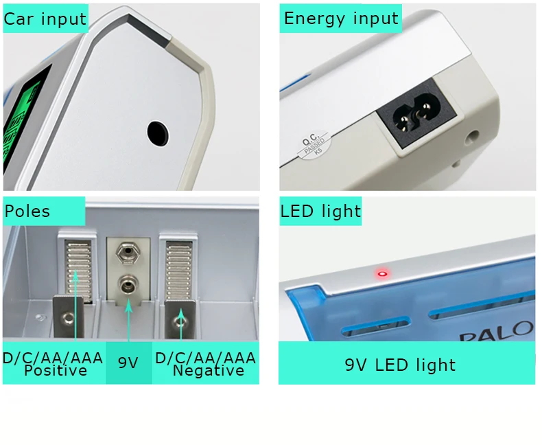 1. Вход: 100-240 В переменного тока, 50/60 Гц 10 Вт, работающего на постоянном токе 12 В в 800mA2. Выход: AA/AAA/C/D 1,2 V DCx4 1000mA, 6F22 9V DC 30mA1. Это зарядное устройство может заряжать 1-4 шт. AA AAA C D Размер Ni-mh или NI-Cd аккумулятор и 1-2 шт. 9 в Ni-MH или NI-CD аккумуляторная батарея.2. Умный чип контролирует процесс зарядки.3. ЖК-экран и светодиодный светильник показывают процесс зарядки, ЖК-дисплей для батареи AA AAA C D, светодиодный аккумулятор 9 В.4. Независимый зарядный канал, множественная защита, поддержка быстрого выпуска.5. В конце процесса зарядки Встроенный микрокомпьютер преобразует режим зарядки от быстрой зарядки в непрерывную зарядку, обеспечивает полную зарядку аккумуляторов и предотвращает чрезмерную зарядку;6. Постоянный ток предотвращает колебания тока, обеспечивает безопасность зарядки;7. Зарядное устройство строго контролирует максимальное время зарядки, гарантирует одновременную зарядку аккумуляторов;8. Функция автоматического распознавания: Уникальный алгоритм для обнаружения плохих или дефектных ячеек, автоматически обнаруживает незаряжаемый или одноразовый аккумулятор и прекращает зарядку