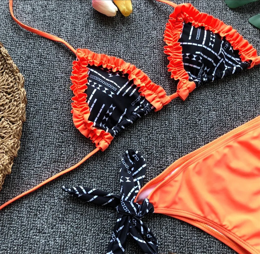 Бикини 2021, сексуальный женский купальник с лямкой на шее и оборками, Женский комплект бикини, купальный костюм, Пляжное бикини, женские бикини