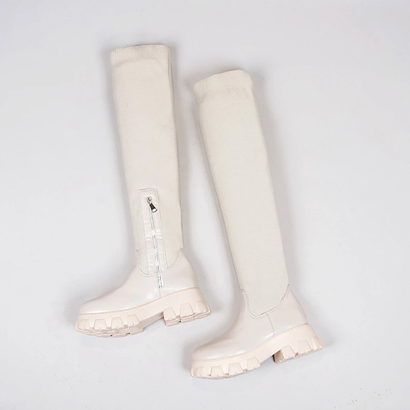Женские ботинки, новинка осень-зима 2022, вязаные эластичные ботинки на платформе и среднем каблуке, удобная повседневная обувь, высокие ботинки до бедра