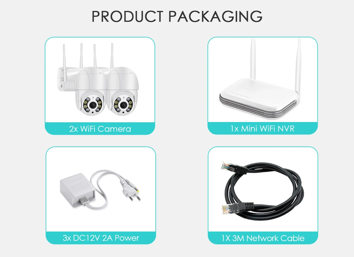 Содержимое упаковки 2 упаковок:2x ptz-камеры (3MP);1х Мини WiFi NVR(8CH);3x12 В источника питания;1 Руководство пользователя;1 х 3 м сетевой кабель;