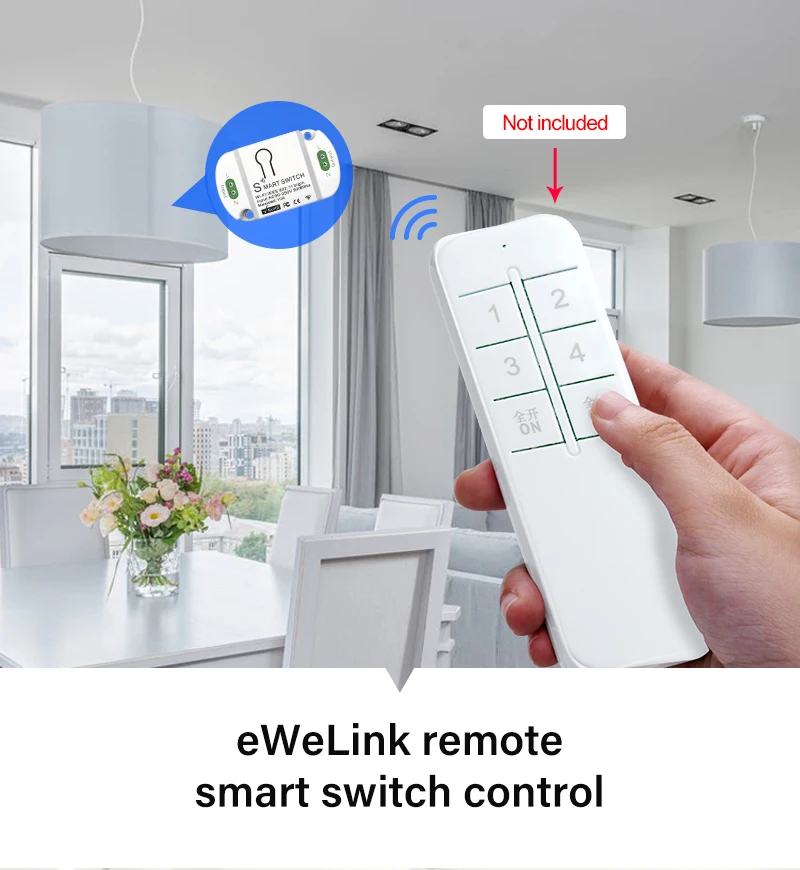 Поддержка дистанционного управления eWeLink и дистанционного беспроводного смарт-переключателя eWeLink, пульт дистанционного управления и удаленный умный беспроводной переключатель специально разработаны для дистанционного Смарт-переключателя eWeLink WiFi. Они могут быть расположены там, где вы хотите быть (лучшее расстояние составляет 15 м). В соответствии с руководством, После сопряжения с смарт-переключателем, его можно управлять с помощью пульта дистанционного управления eWeLink и удаленного интеллектуального беспроводного переключателя.