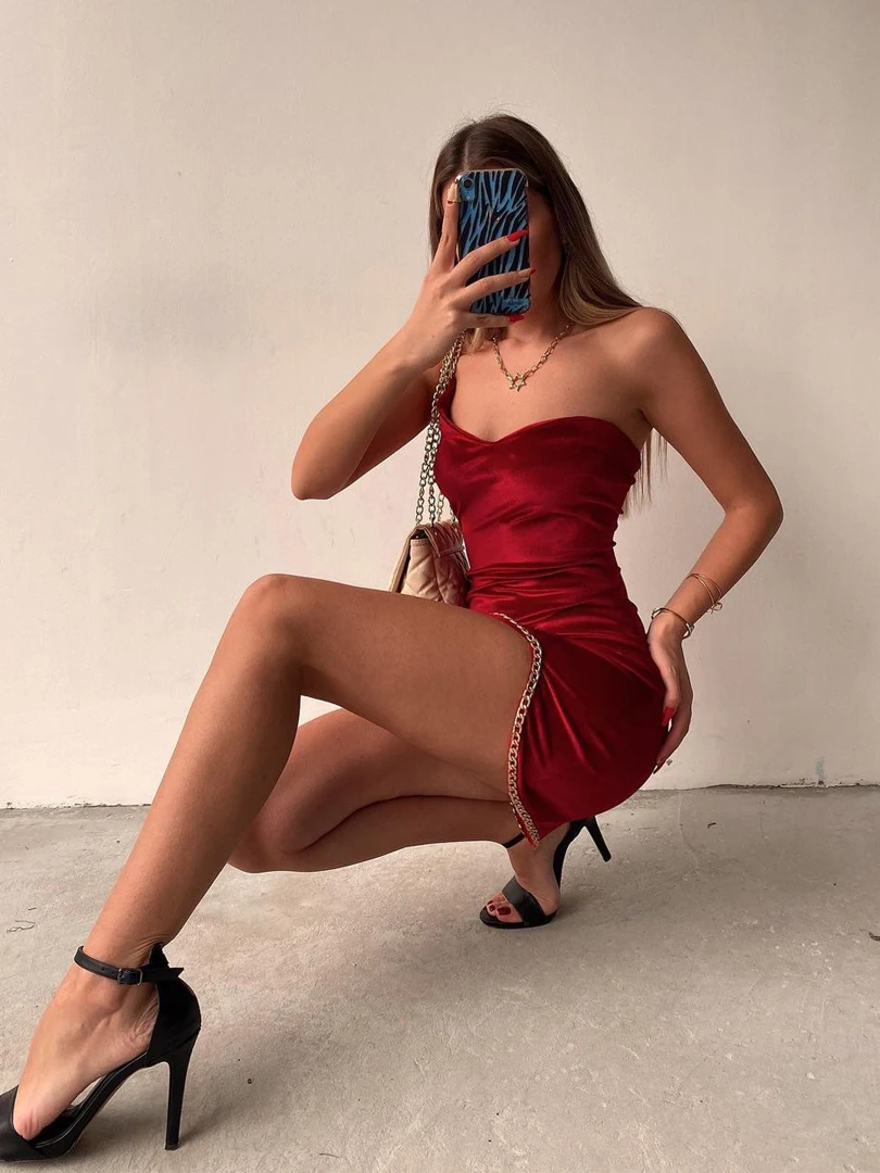 Chicology 2021, женское платье с волнистой цепочкой, на одно плечо, сексуальное, красное, бархатное, элегантное, облегающее, праздничные, вечерние, Клубные, без рукавов, вечернее, зимнее платье
