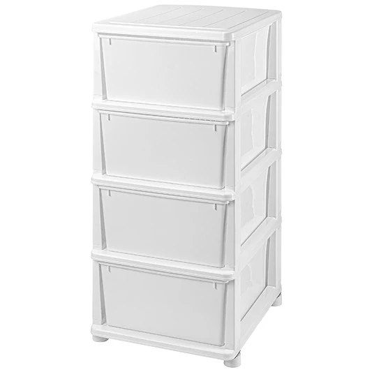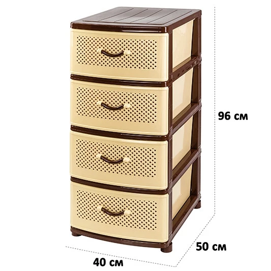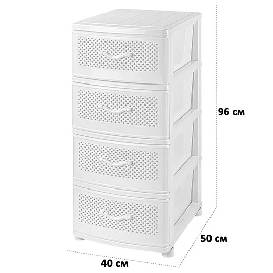 Полное описание4 ящика (47х35х20 см). Размеры комода 40×50×96 см. Собирается без инструментов.Техническое описаниеТип: комодКоличество секций: 4 шт.Размеры ящика (внутренние): 47х35х20 смРазмер дна: 46х32 смРазмеры комода: 40×50×96 смВысота ножек: 3 смМатериал: пластик