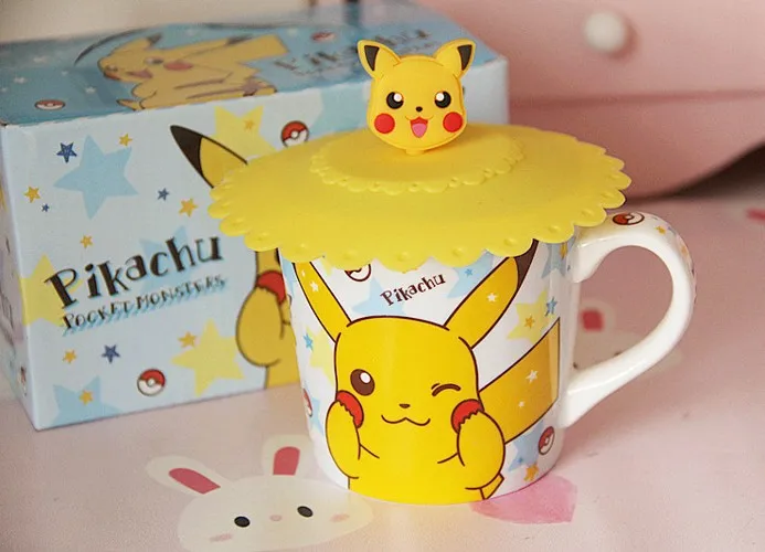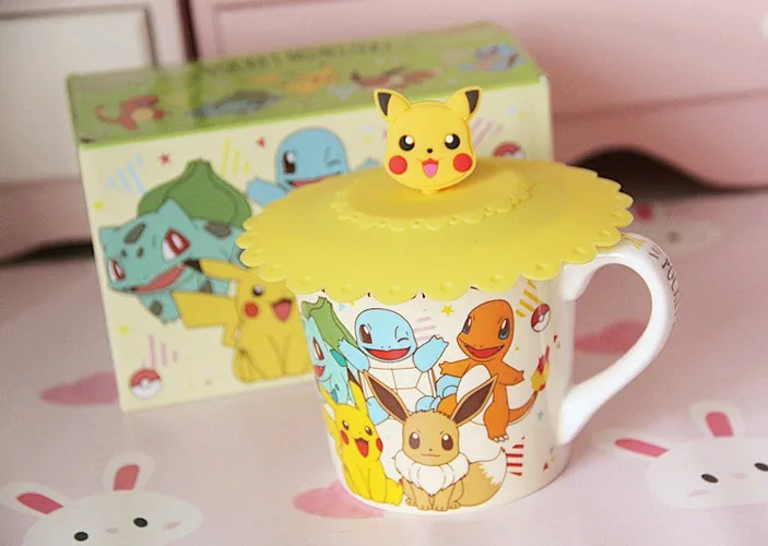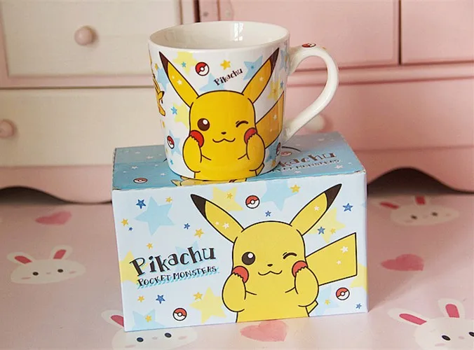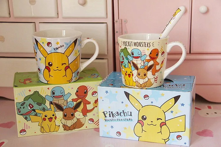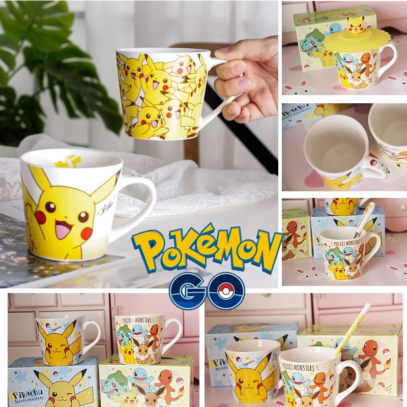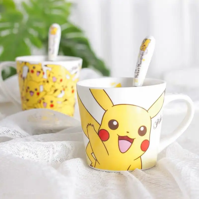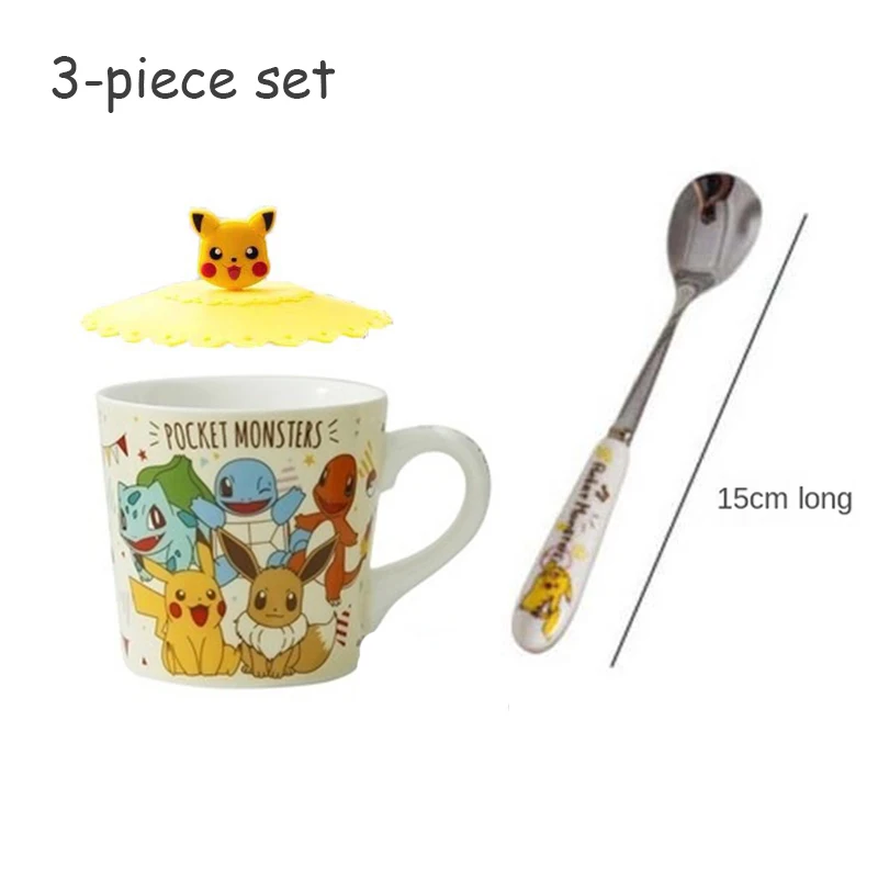 Керамическая кофейная чашка Pokemon Pikachu, домашний завтрак, 250 мл, семейный креативный детский подарок, набор из 3 предметов, чашка, ложка, подставка