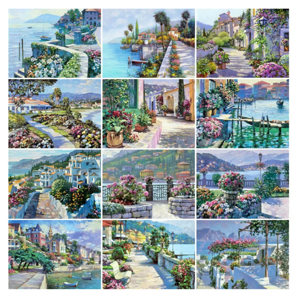 Алмазная 5D живопись сделай сам, вышивка крестиком, цветок, город у моря, алмазная вышивка, пейзаж, картина стразы, украшение для дома