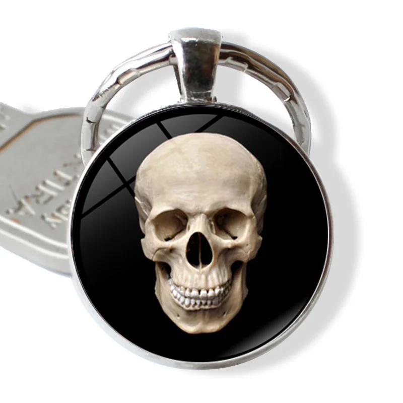 Брелок для ключей со скелетом, черепом, дизайнерский круглый стеклянный кулон с рисунком черепа, металлический брелок, брелок для ключей, мужской подарок