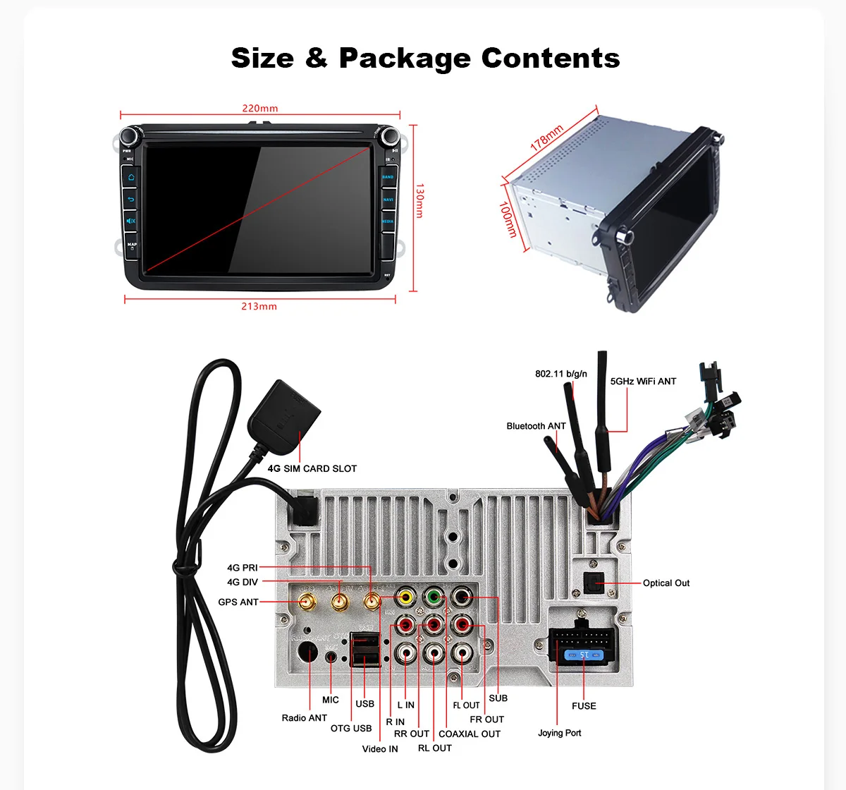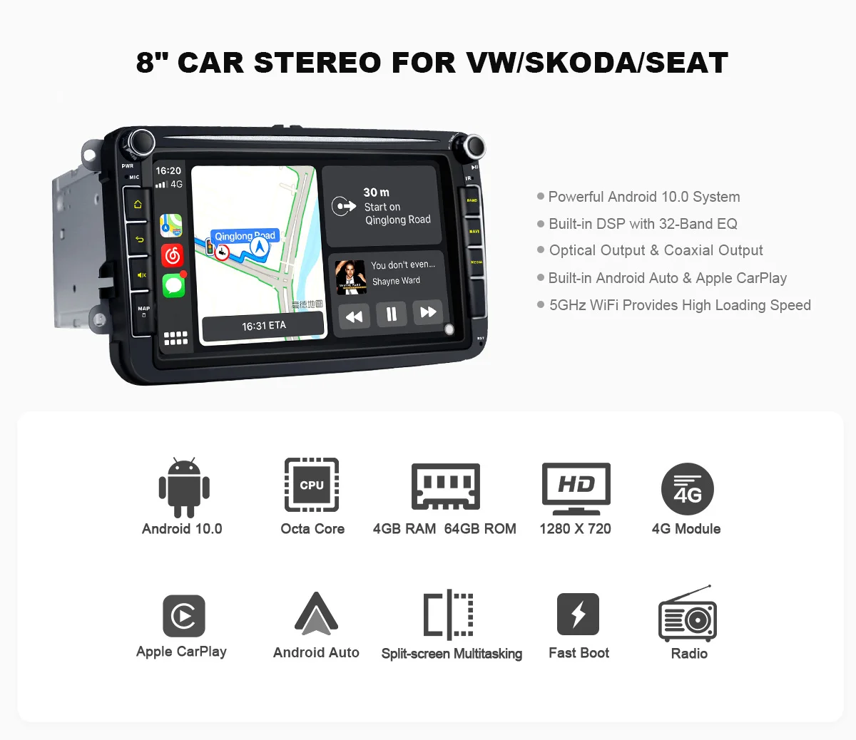 * Мощная система Android 10.0.* CPU:UIS7862 Восьмиядерный 1.8GHz@4.0GB (память) + 64 ГБ (память).* Встроенный Android Auto & Apply Carplay.* Встроенный слот для sim-карты.* Оптический выход и коаксиальный выход.* Встроенный DSP с 32-полосным эквалайзером.* 5 ГГц WIFI обеспечивает высокую скорость загрузки.* Радиочип TDA7786, чип усилителя: TDA 7851.