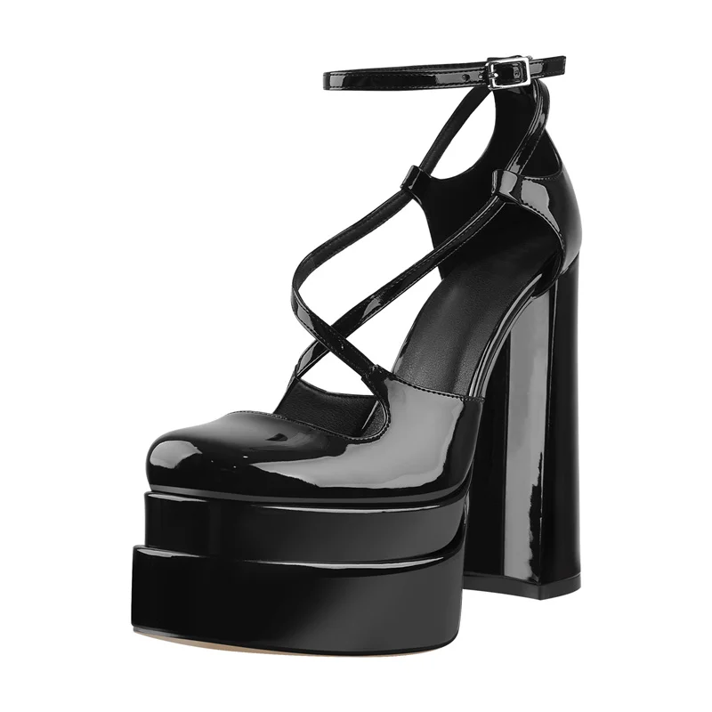 Женские туфли-лодочки на платформе Onlymaker, летние черные туфли из лакированной кожи с перекрестной шнуровкой и квадратным носком, модные удобные туфли на толстом высоком каблуке для вечеринки