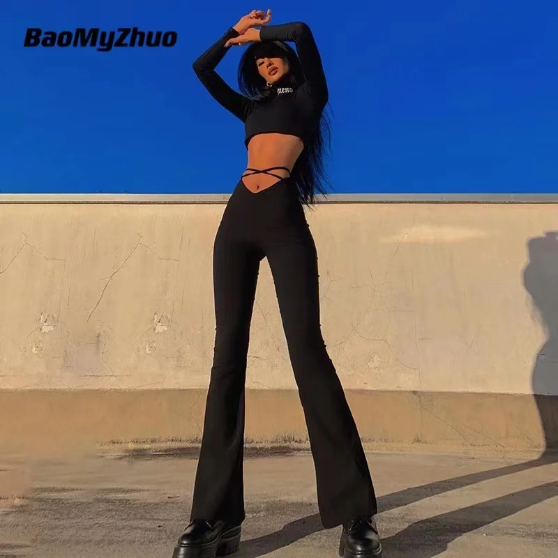 Брюки-клеш Женские, с высокой талией, черные, на шнуровке, 2021