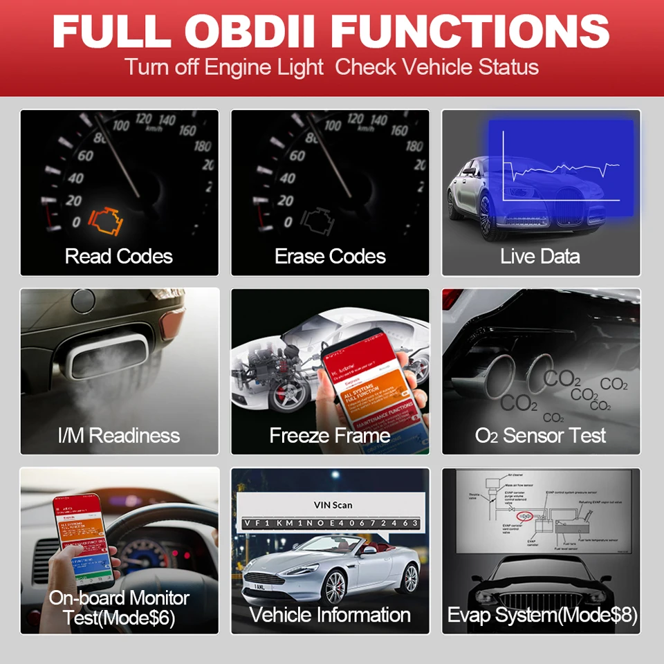 *-Быстро считывает широкий ток, отложенные и постоянные коды в системе OBD*-Четкие обнаруженные коды неисправностей и эффективно выключите контрольный светильник двигателя*-Просмотр графических данных в реальном времени компьютерного модуля (ов) транспортного средства для легкого анализа*-Просмотр рабочих параметров транспортного средства в момент обнаружения DTC*-Прочтите состояние готовности I/M, чтобы транспортное средство было проверено на соответствие государственным выбросам*-Выполнить испытание датчика O2 для проверки топливной эффективности и выбросов транспортного средства*-Чтение результатов бортовых диагностических тестов мониторинга для конкретных компонентов/систем*-Полностью извлеките информацию о транспортном средстве от VIN, CINs и CVNs*-Выполнить испытание компонентов, позволяя начать испытание на утечку для Системы EVAP транспортного средства