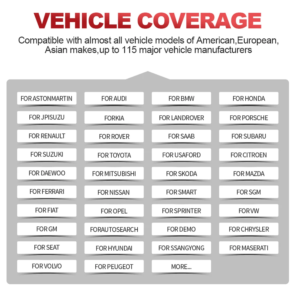 Для диагностики OBDII устройство считывания кодов obd2 отлично подходит для большинства автомобилей, построенных в 1996 году или более поздней версии, совместимо со следующими протоколами:-ISO 14230-4 (KWP2000)-ISO 15765-4 (CAN)-ISO 9141-2 (iso)-ISO 14229 (uds)-SAE J1850 (VPW & PWM)-Оригинальные протоколы производителейДля расширенных функций, как активный тест, все системы диагностики и обслуживания, он охватывает 95% моделей автомобилей, доступных на рынке, включая:-Азия:Для Daewoo, для Honda, для JP Isuzu, для Kia, для Mazda, для Mitsubishi, для Nissan, для SGM, для Subaru, для Suzuki, для Toyota, для Hyundai, для Ssangyong-Европа:Для Aston Martin, для Audi, для Benz, для BMW, для Citroen, для Ferrari, для Fiat, для Land Rover, для Maserati, для Opel, для Porsche, для Renault, для Rover, для Saab, для Seat, для Skoda, для Smart, для Sprinter, для Volvo, Для VW, для Peugeot-Америка:Для Chrysler, для USA-Ford, для GMИ продолжайте обновлять