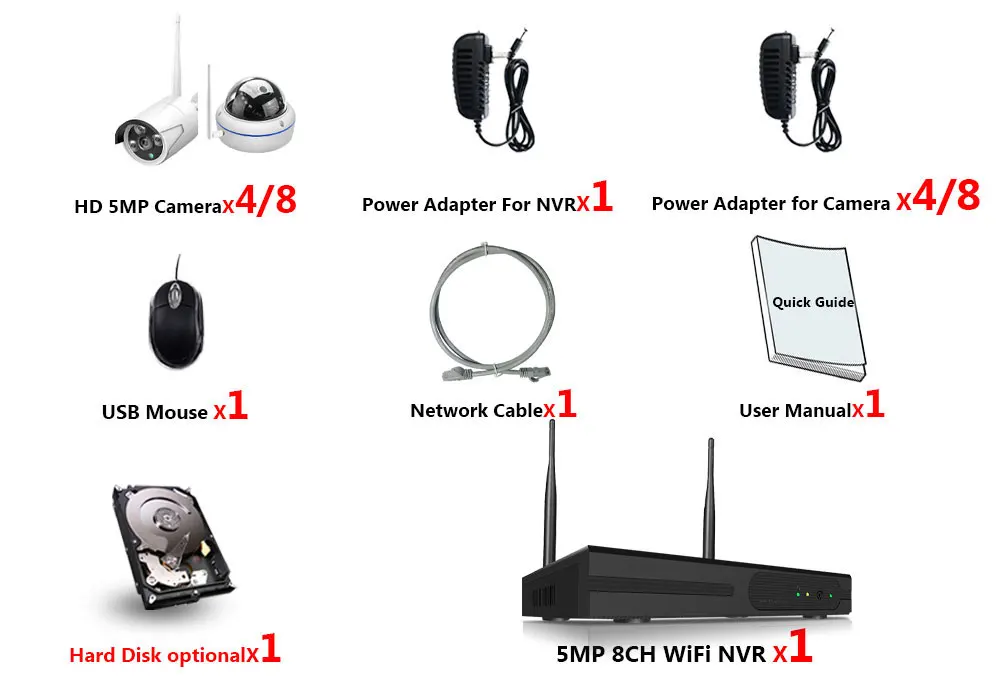 1x 8CH 5MP беспроводной WiFi NVR рекордер;4/8x Ультра HD 5MP беспроводная WiFi пуля ip-камеры;4/8x источник питания для камеры;1x источник питания для NVR;1 usb-мышь (подарок);1x 3 фута 1 м Ethernet кабель (подарок);1x быстрая инструкция;Жесткий диск опционально!
