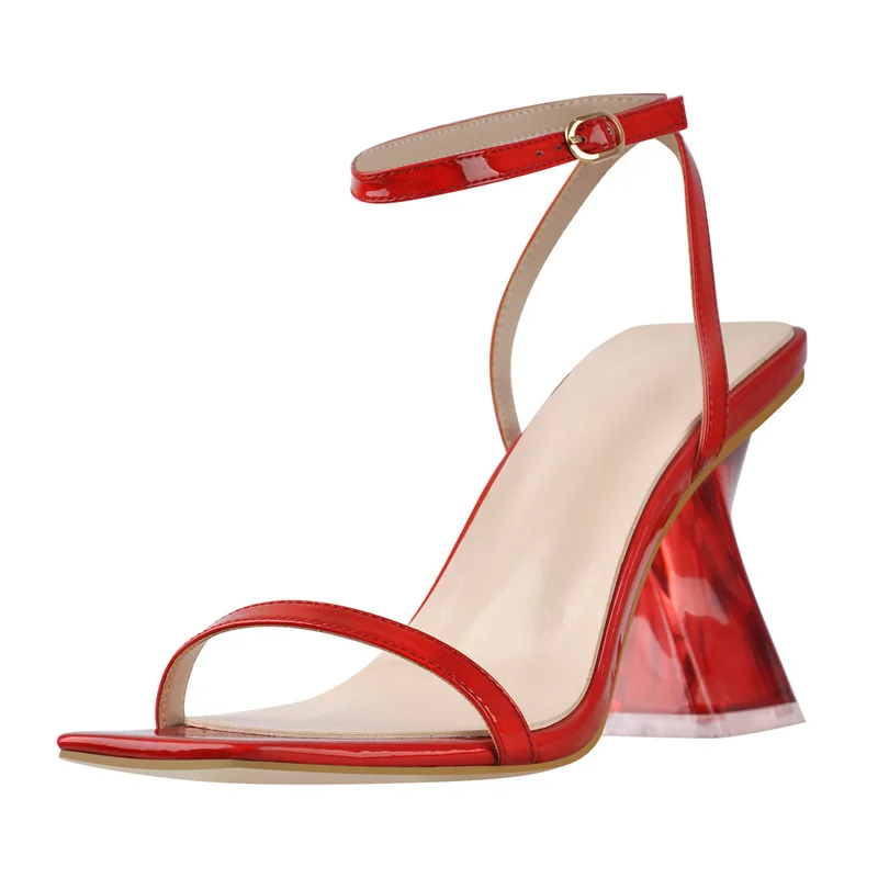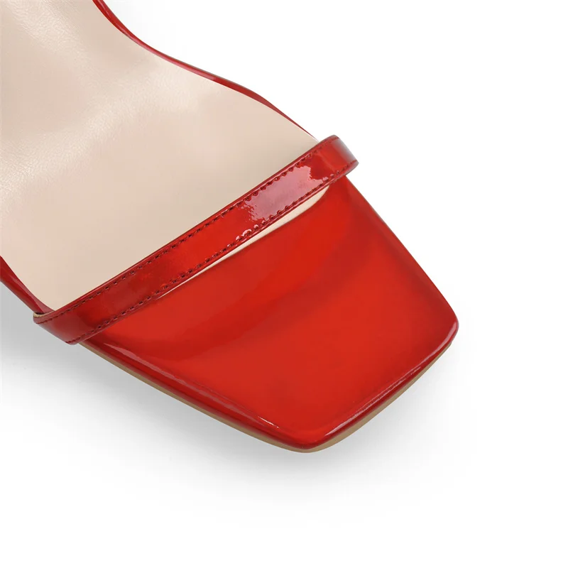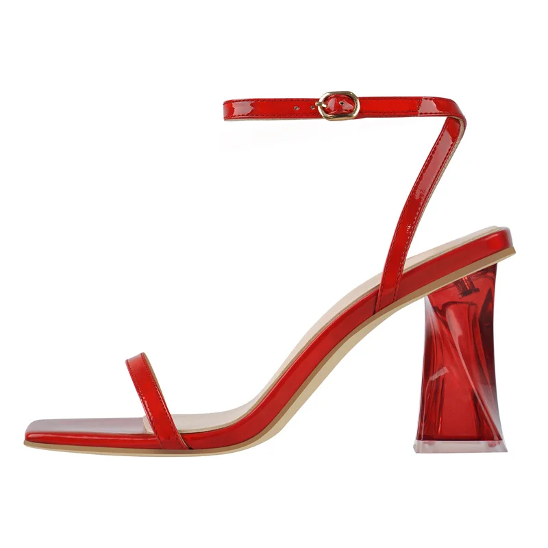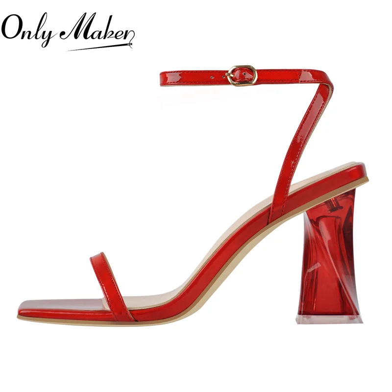 Женские повседневные босоножки Onlymaker, красные лакированные кожаные сандалии с квадратным носком и пряжкой до щиколотки, прозрачные пикантные повседневные туфли странного стиля на высоком каблуке