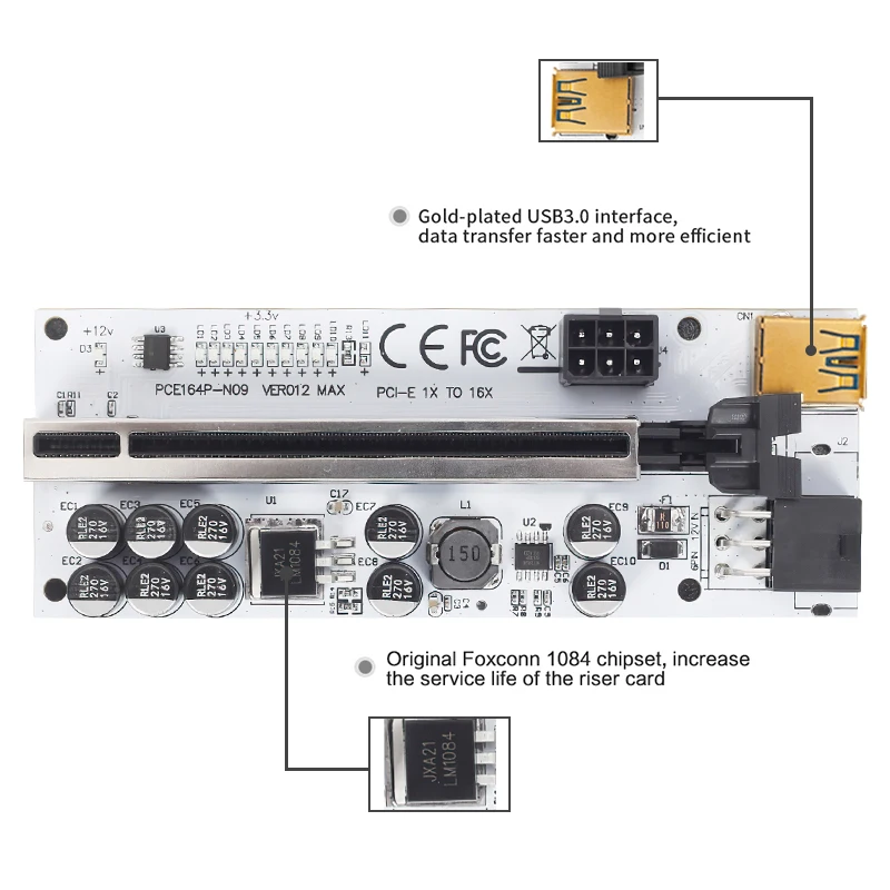 1. Новейшая версия VER012 MAX Mining Super2. Использование кабеля USB 3,0 длиной 60 см в качестве удлинителя, высокое качество и супер скорость.3. С 10х FP твердотельными конденсаторами, что делает Графический источник питания более стабильным и безопасным.4. Позолоченные контакты для лучшего подключения и длительного срока службы.5. Совместимость с разъемом 1x,2x,4x,8x,16x PCI-E материнской платы.6. Драйвер не нужен7. Предназначен для майнинга биткойнов8. Мощность с помощью двух разных 6-PIN входов на борту riser.9. 12 Светодиодный светильник s на основной плате и один светодиодный светильник на чипсовой плате 1X.10. Светодиод может помочь шахтеру лучше контролировать неисправности, очень удобно, быстро и стабильно!