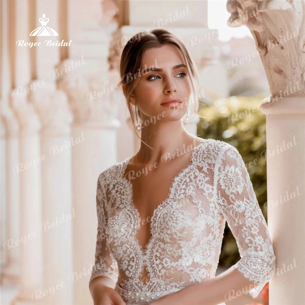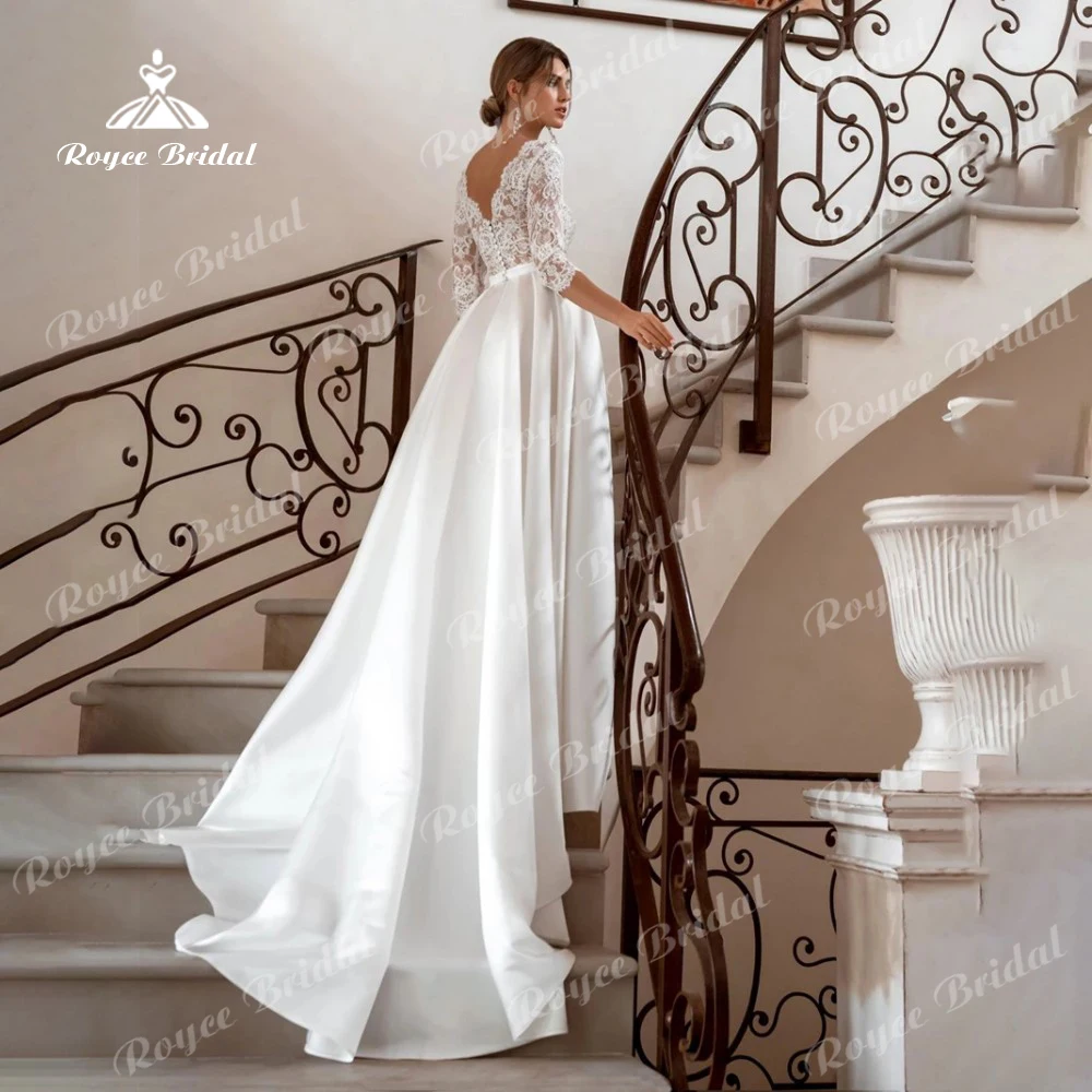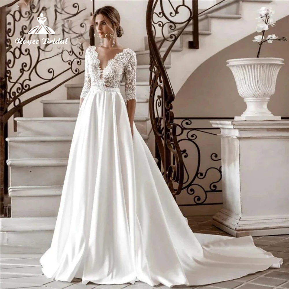 Женское атласное платье до пола, элегантное кружевное свадебное платье-трапеция с V-образным вырезом и рукавом до локтя, осень