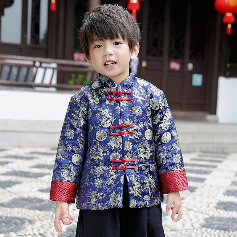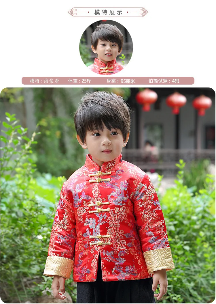 Китайская традиционная одежда для детей, новогодний праздничный костюм для маленьких мальчиков в стиле ретро с изящным золотым Драконом Тан, Атласный топ с принтом, комплект штанов