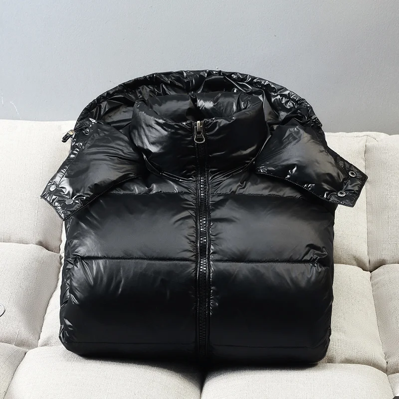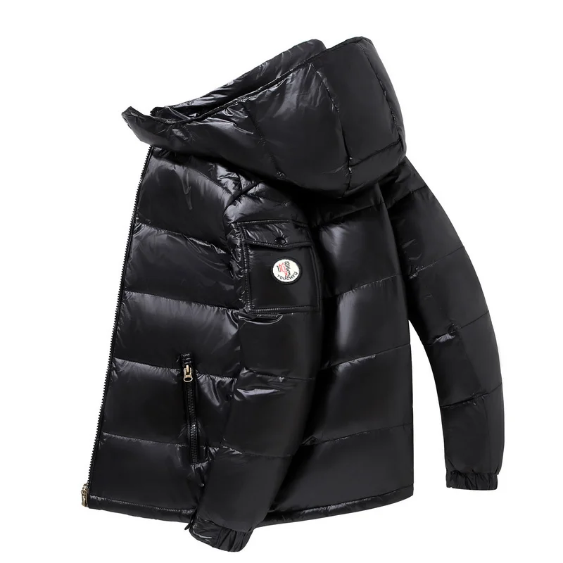 Мужская теплая куртка, блестящее зимнее пальто, капюшон на белом ут...