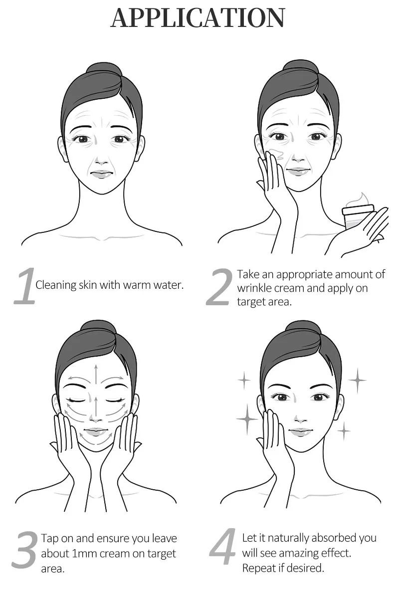 1. Очистка кожи теплой водой.2. Возьмите соответствующее количество крема от морщин и нанесите на целевую область.3. Нажмите и убедитесь, что вы оставили около 1 мм крема на целевой области.4. Пусть он естественно впитывается, вы увидите потрясающий эффект. Повторите, если хотите.