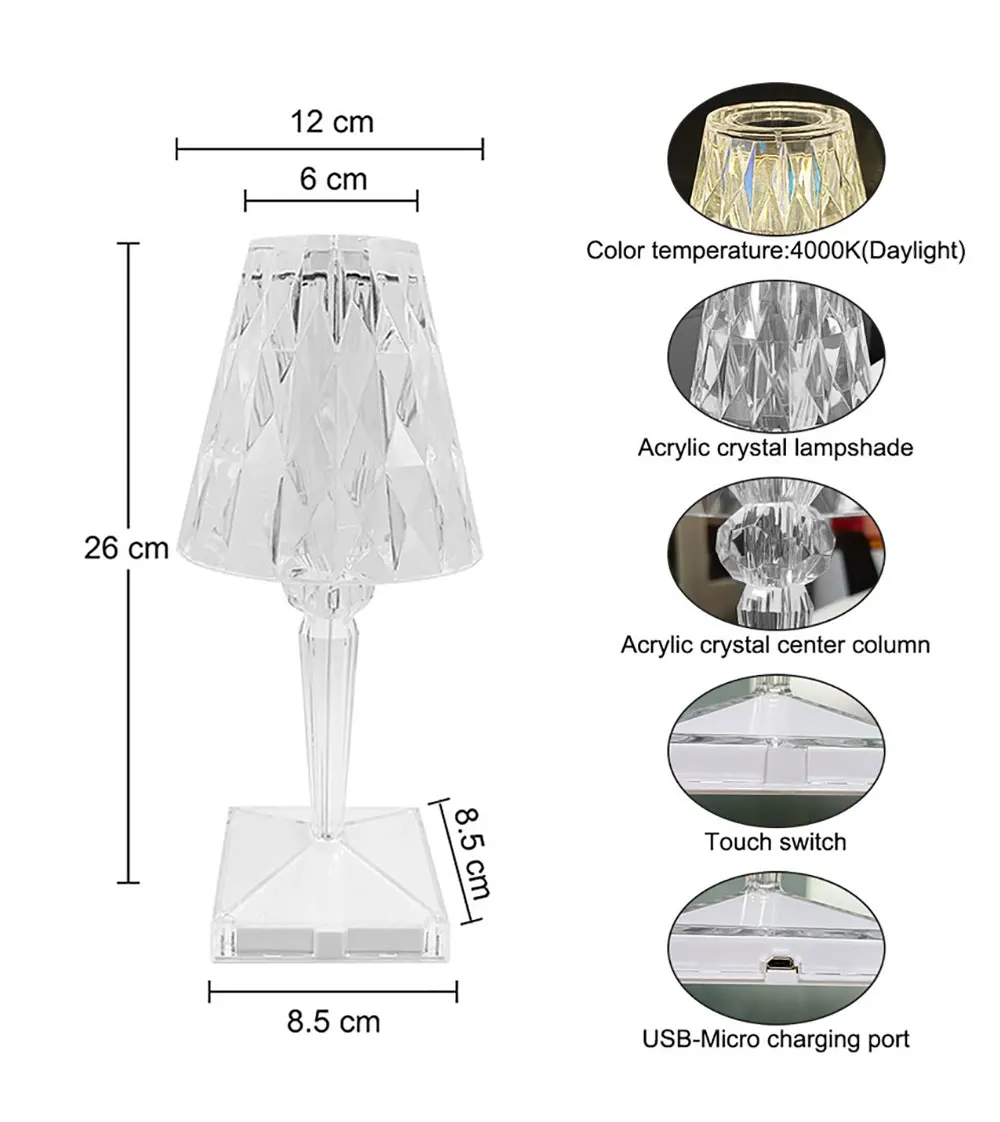 * Изделие Naam: акрил Kristallen Tafel Lamp * Режим переключения: touch schakelaar * Гаечный ключ Nominale: 5 В * Материал корпуса: акрил * Kleurweerged-индекс: 120