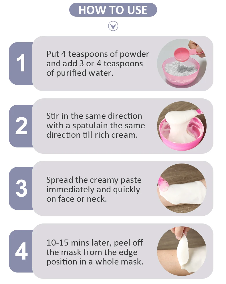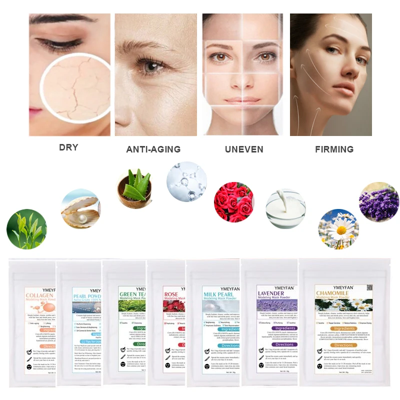 Коллагеновая Порошковая маска: Омолаживающая, подтягивающая, укрепляющая и эластичнаяМаска с розовым порошком: Питательная, увлажняющая и осветляющаяМолочная жемчужная Порошковая маска: нежная и успокаивающая, отбеливающая и питательнаяПорошок лаванды маска: Детоксикация и очищение и успокаивает и анти акнеМаска для порошка ромашки: успокаивает и восстанавливает чувствительную кожу, уменьшает покраснение и улучшает сушкаПорошок Алоэ Маска: успокаивает и питает, восстанавливает и увлажняет солнцеМаска для порошка зеленого чая: очищающая и успокаивающая, освежающая и маслянаяПоддержка Прямая поставка, оптовая продажа и низкий минимальный заказ для вашей частной маркировки.Не пропустите, вы этого заслуживаете!Направления:1. Положите около 3 или 4 чайных ложек порошка и добавьте 3 чайных ложки очищенной воды, быстро помешивая лопаткой до консистенции насыщенного крема (обычно соотношение 1:1 или 4:3 порошка: воды).2. Распределите кремовую пасту сразу и быстро по всему лицу, за исключением ноздрей.3. Оставьте маску на 15-20 минут. Снимите маску в одной непрерывной части, вытрите оставшуюся маску, затем продолжите обычное лечение лица