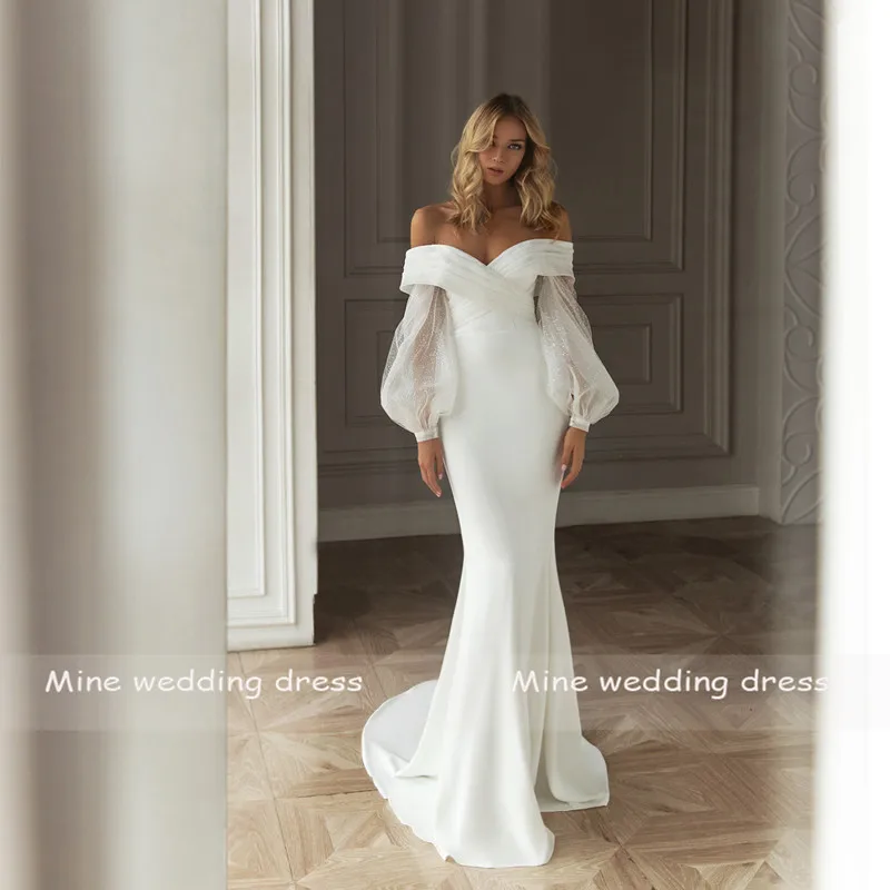 Блестящее атласное свадебное платье с открытыми плечами и рукавами