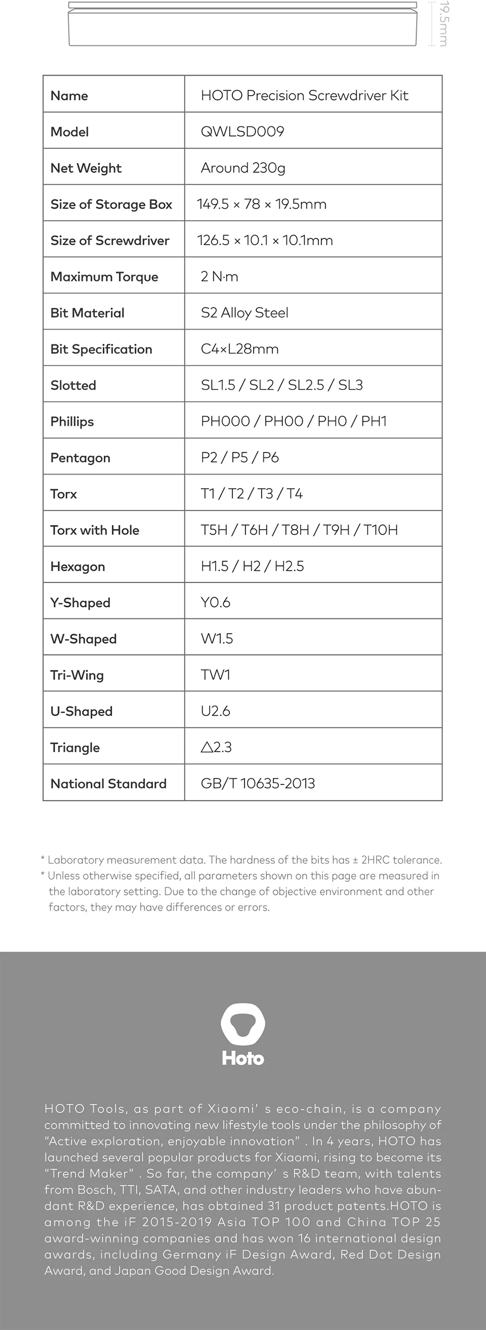 Наименование: Набор прецизионных отверток HOTOМодель: QWLSD009Вес нетто: около 230 гРазмеры коробка для хранения: 149,5*78*19,5 ммРазмер отвертки 126,5*10,1*10,1 ммМаксимальный крутящий момент: 2Н. ММатериал бит: легированная сталь S2Спецификация бит: c4xl28ммПрорези: SL1.5/SL2/SL2.5/SL3Phillips:PH000/ PH0O/ PHO/ PH1Пентагон: P2/P5/P6Торкс: T1/T2/T3/T4Торкс с отверстием: T5H/ T6H/ T8H/T9H/ T10HШестигранник: H1.5/H2/ H2.5Y-образный: Y0.6W-Shaped:W1.5Три крыла: TW1U-образный: U2.6Треугольники: △ 2,3