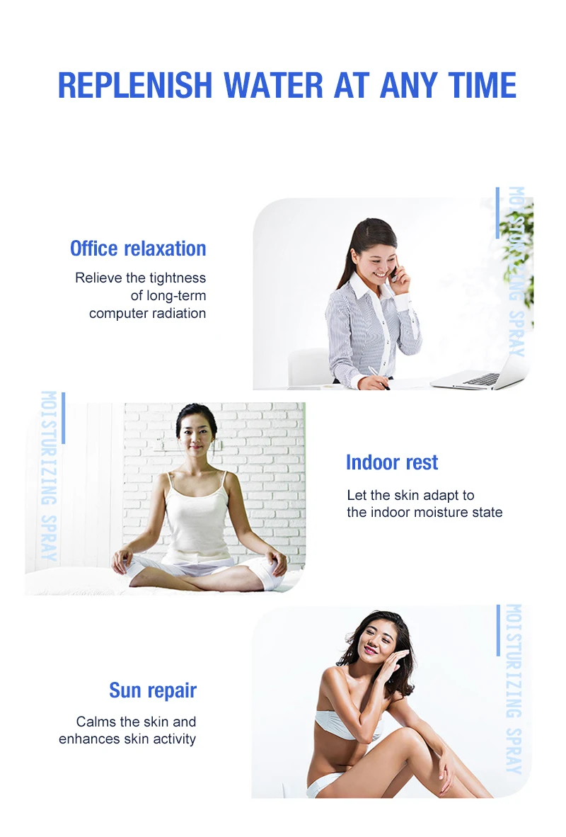 3. Увлажнение без макияжа, ежедневный уход за кожей (расстояние от распылителя 10-15 см не будет конденсировать капли воды)