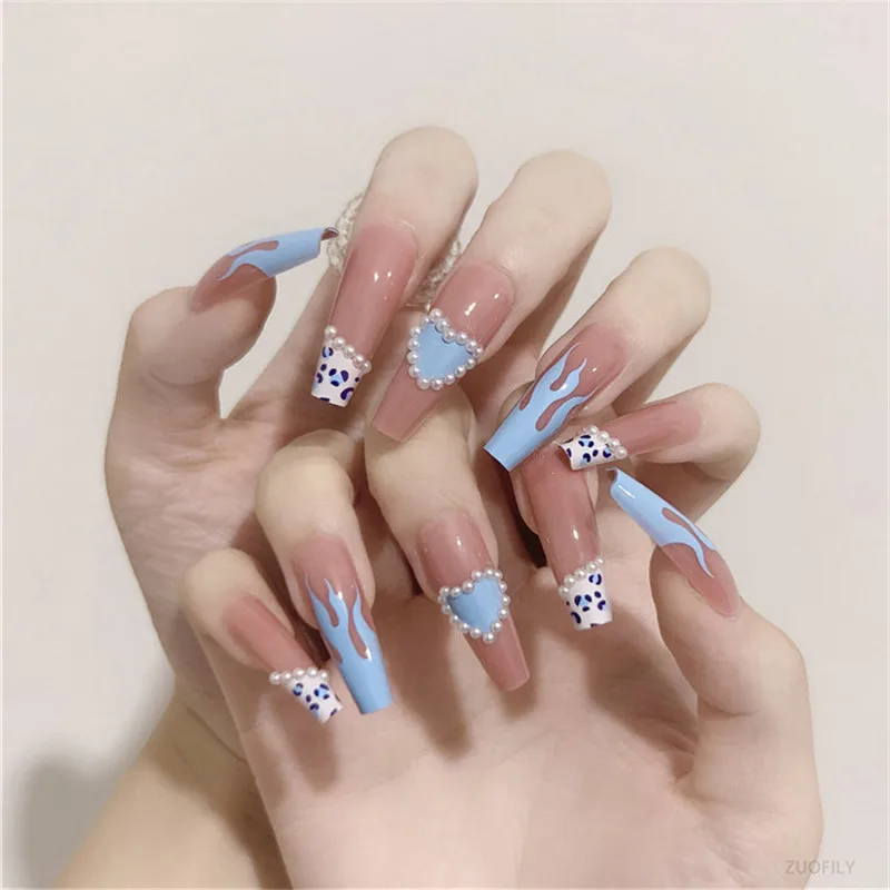 Накладные ногти в французском стиле с длинным бантом, 24 шт., милые цветы, синее пламя, съемные накладные ногти для маникюра, дизайн ногтей