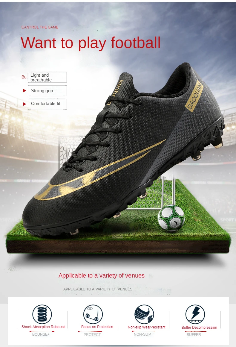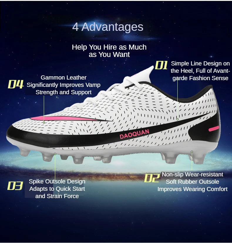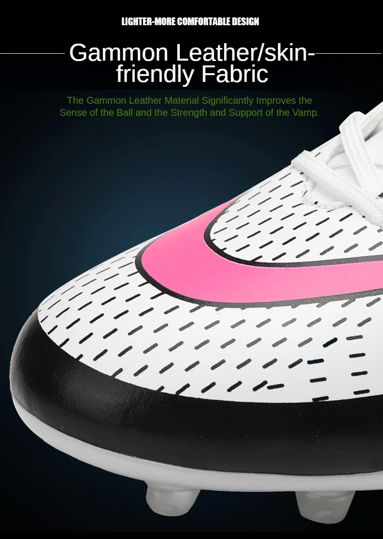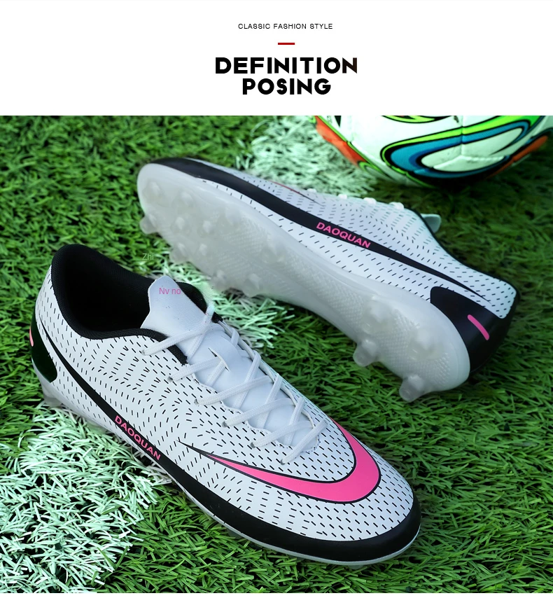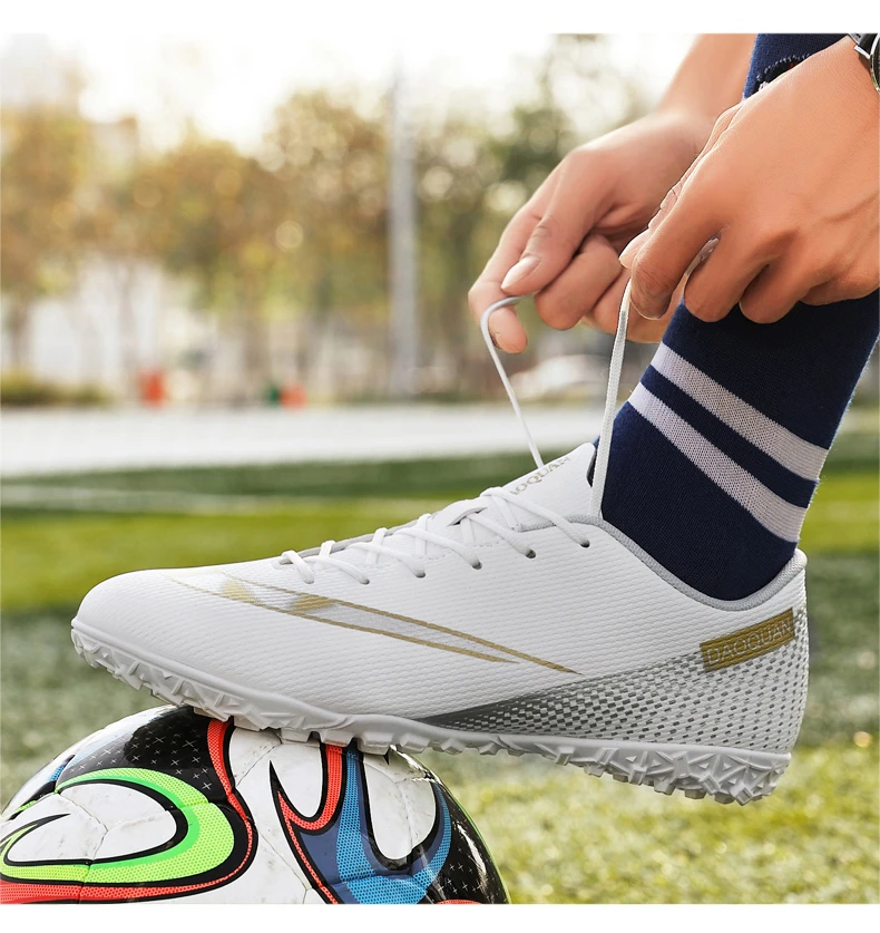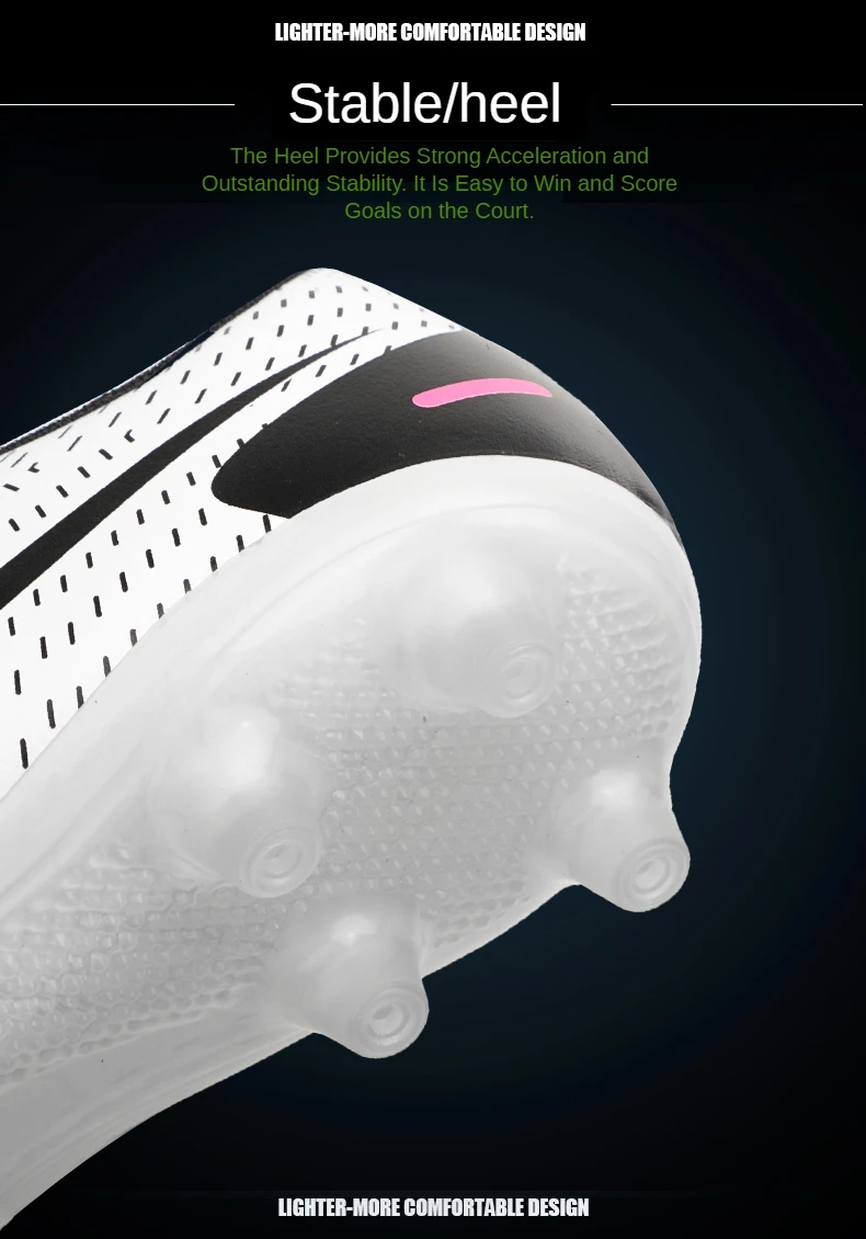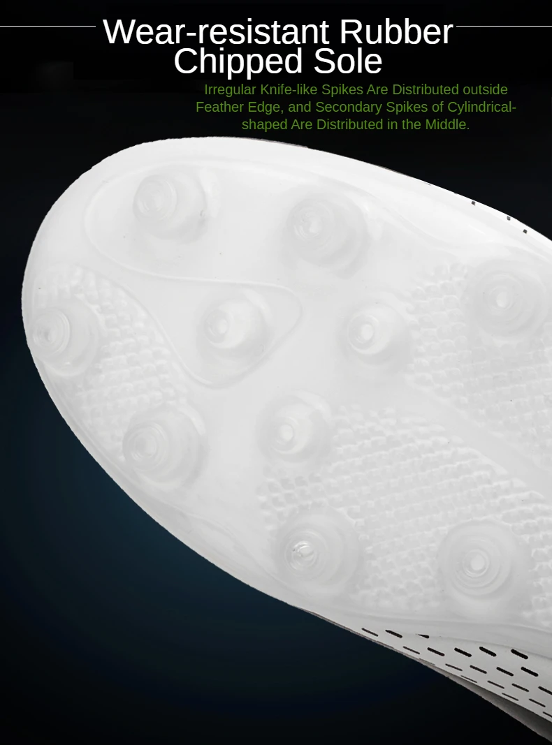 Подошва имеет высокоэффективный отскок, короткую пригвоздированную подошву, хорошую эластичность, обеспечивая гибкость, не теряя прочности, четкую текстуру, нескользящую и износостойкую, построенный с богатым опытом футбольной обуви и высокоскоростным развитием современной футбольной профессиональной футбольной обуви