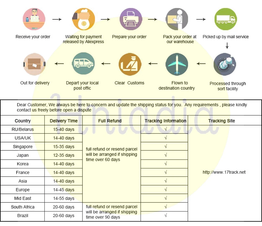 1) Мы принимаем Alipay, West Union, TT. Все основные кредитные карты принимаются через безопасный платежный процессор ESCROW.2) оплата должна быть произведена в течение 3 дней с момента заказа.3) Если вы не можете проверить сразу после закрытия аукциона, пожалуйста, подождите несколько минут и повторите попыткуЗавершено в течение 3 дней.4) Мы не несем ответственности за любые таможенные пошлины или налог на импорт.О доставке1. Доставка по всему миру. (За исключением некоторых стран и APO/FPO)2. Все Товары в наличии, пожалуйста, просто покупайте. Все заказы обрабатываются в течение 48 часов после подтверждения оплаты.3. Пожалуйста, убедитесь, что ваше имя и адрес соответствуют aliexpress, неправильный адрес или имя чехол ruturn или не получилОтветственность покупателя.4. Время доставки определяется перевозчиком и не включает выходные и праздничные дни. Время доставки может меняться,Особенно в сезон отпусков.5. Время доставки: (среднее время прибытия для справки)