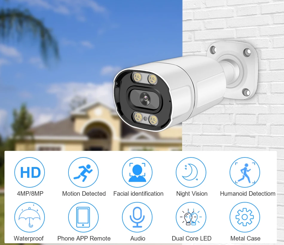 1. Эта камера поддерживает 4 МП, 8 МП (4K) Ультра-четкое разрешение;2. Поддерживает обнаружение формы человека и распознавание лица;3. Поддержка h.265ai / h.265 + (Совместимость с h.265 / H.264) технология сжатия видео;4. Поддержка протокола onvif и доступ к сторонним/вечерние платформам;5. Камера имеет 4 шт. двойной светильник wick led и поддерживает три режима (дневное видение, ночное видение, полноцветное ночное видение), при обнаружении движения Включите полноцветный режим.6. Встроенные микрофоны камеры, поддержка аудио функции;7. Поддержка IE,Firefox,Google Browser.8. Используется металлический материал, используется на открытом воздухе/в помещении, водонепроницаемый IP669. Стандартный объектив: HD 3,6 мм (2,8 мм/6 мм/8 мм опционально)10. Поддержка Мобильный телефон Удаленный доступ легко, как: iPhone, Andorid; Приложение: XMEYE