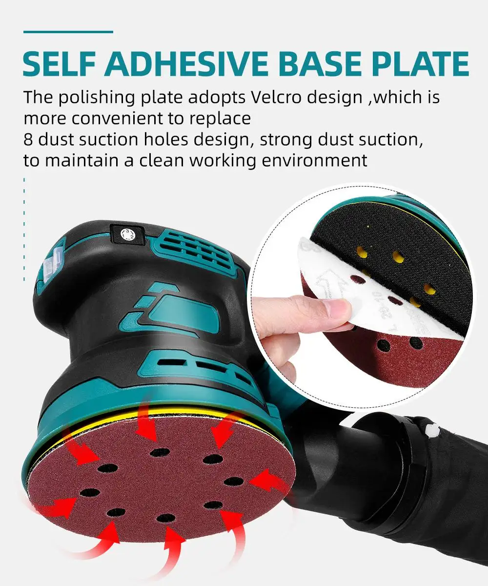 Технические характеристикиЦвет: синий + черныйНапряжение: 18 вТрехскоростная Регулируемая скорость: 8000/10000/12000 об/минРазмер: 125 ммНаждачная бумага: 120, 150180 сетка