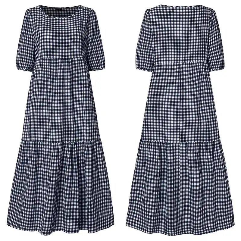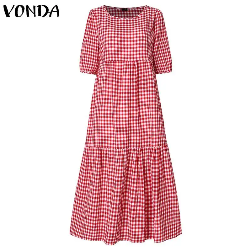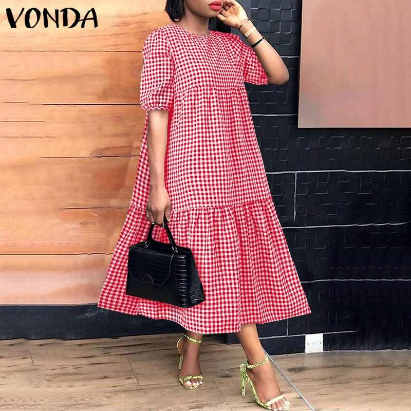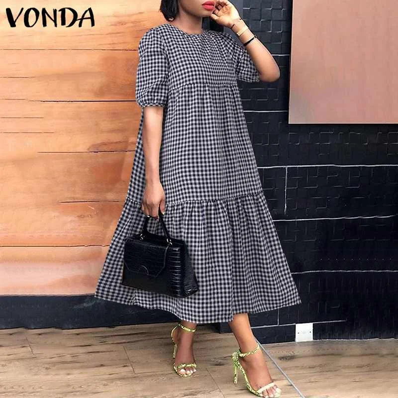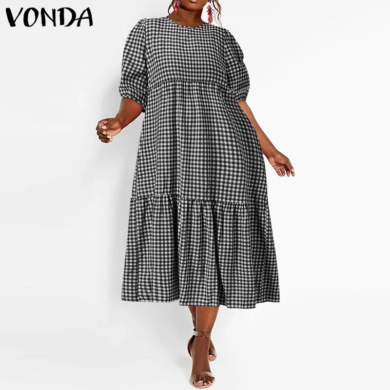 Женское богемное клетчатое платье VONDA, летнее платье средней длины с коротким рукавом-фонариком, повседневное свободное Плиссированное пляжное платье