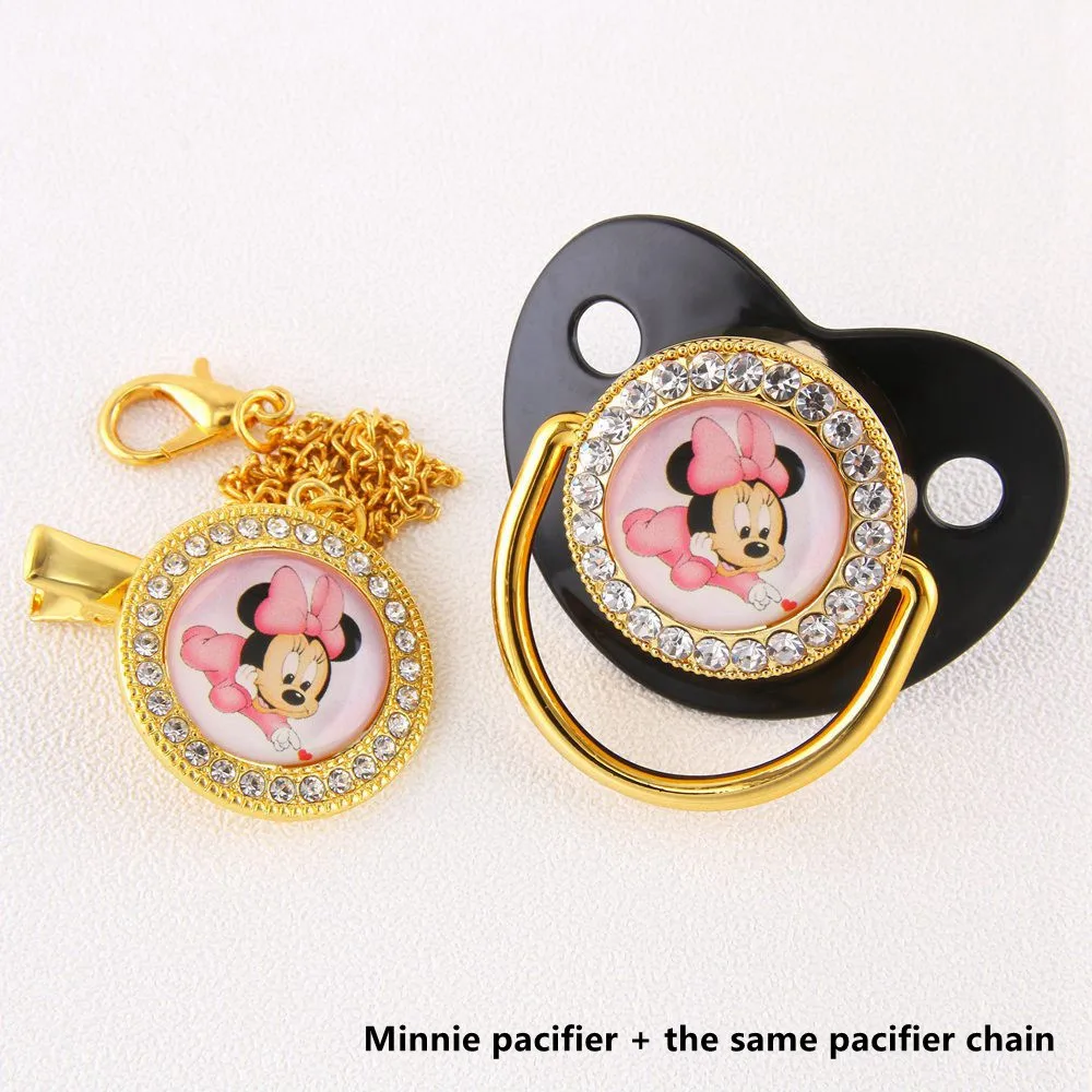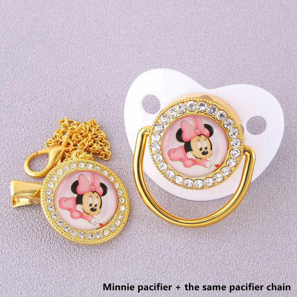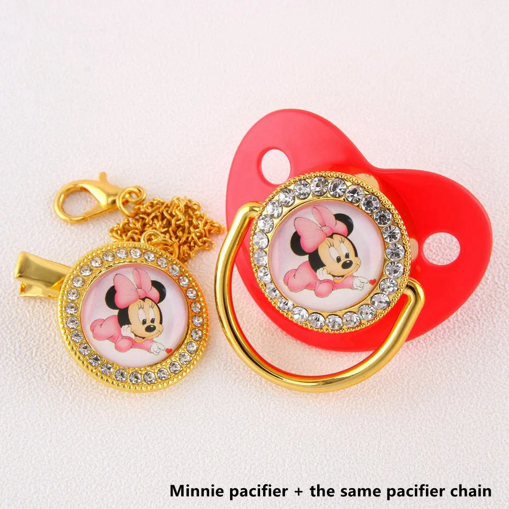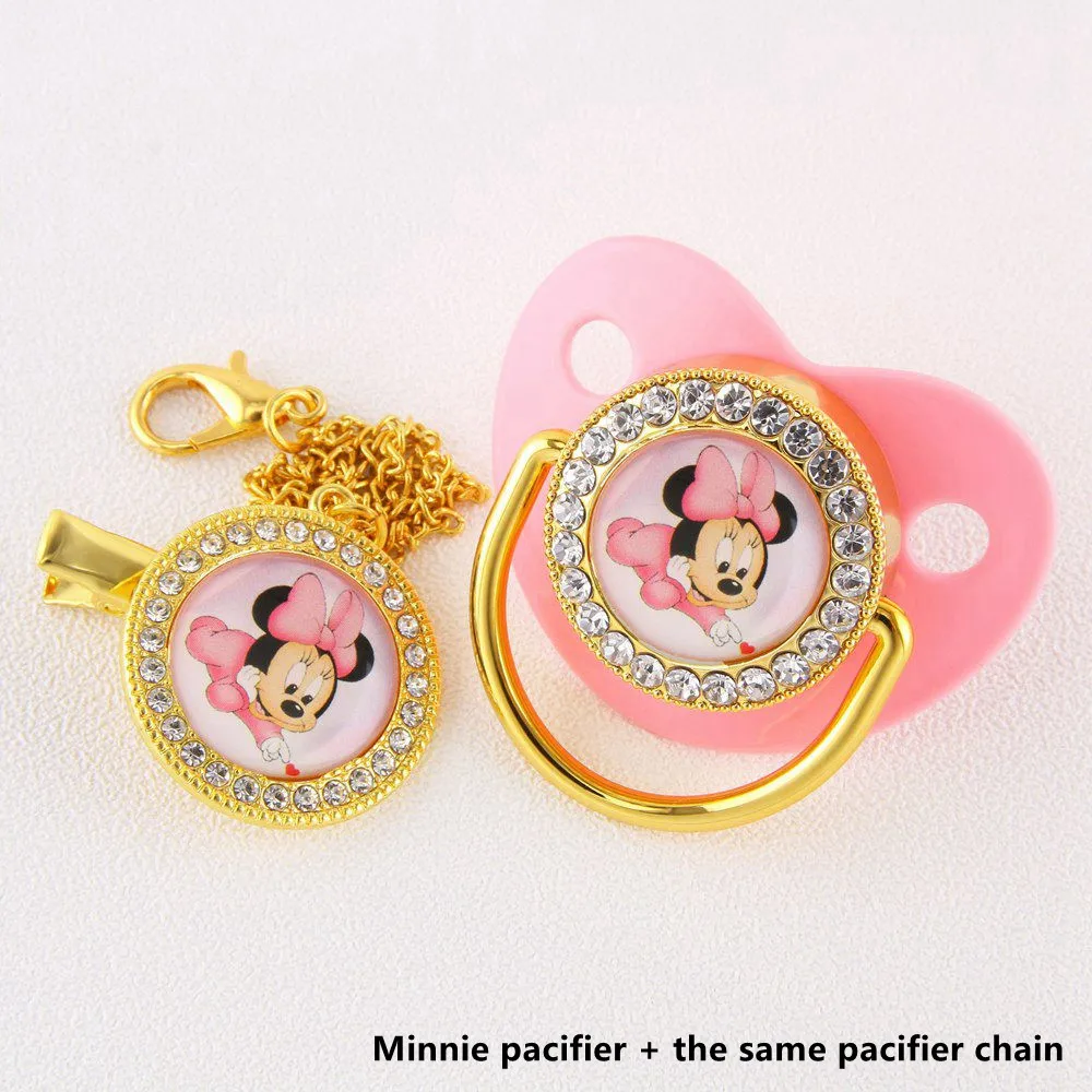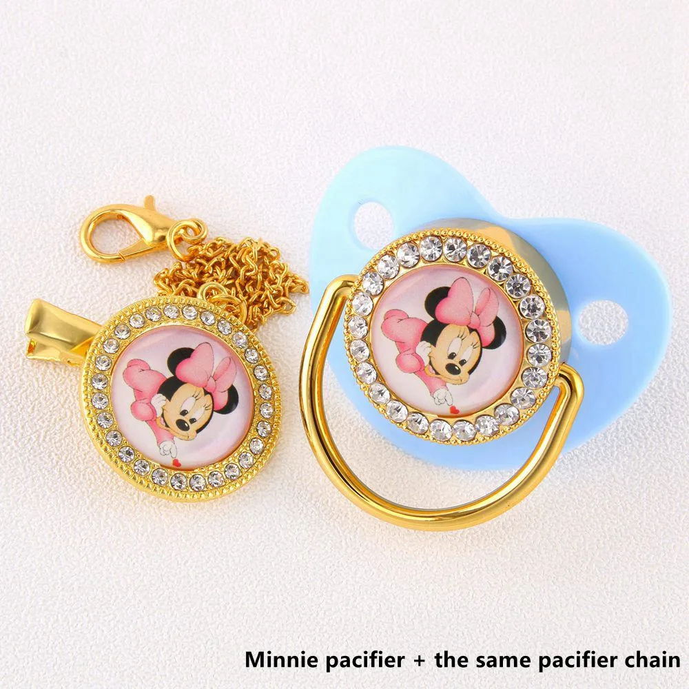 Детская пустышка Disney Minnie image с зажимом для соски и зажимом для соски 0-18 месяцев, безопасная для детей, силиконовая, Гутта-перча, стальная пустышка с золотым зажимом