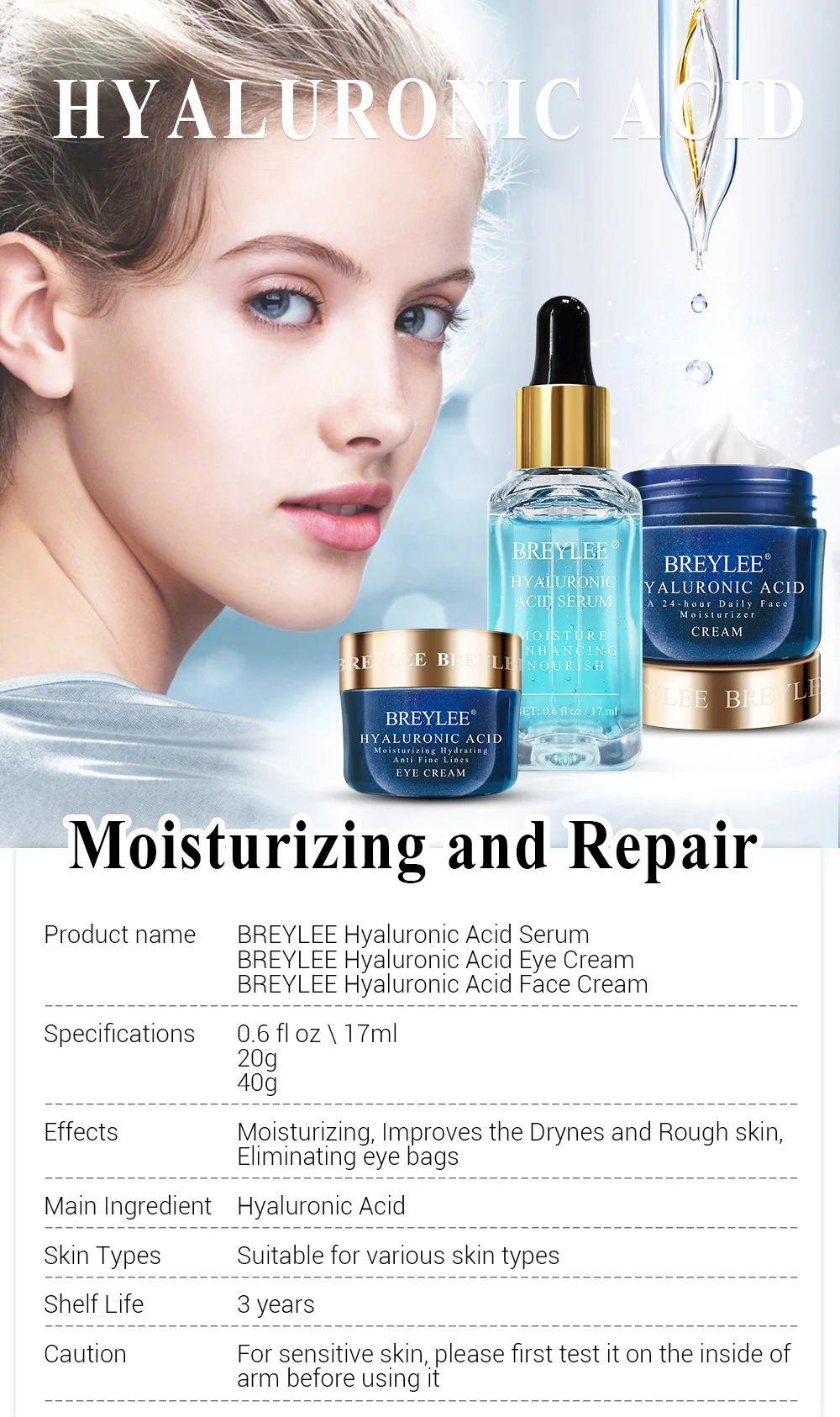 Сыворотка гиалуроновой кислотыЭссенция может быстро доходить до нижней части кожи, разблокируя проходы кожи; Она может быстро улучшить сухость кожи и облегчить пронизывание других продуктов по уходу за кожейКрем для глаз против тонких линийОн может улучшить сухую кожу вокруг глаз и удалить тонкие линии и мешки под глазамиОсвежающий, не жирный, который легко впитывается вашей кожей