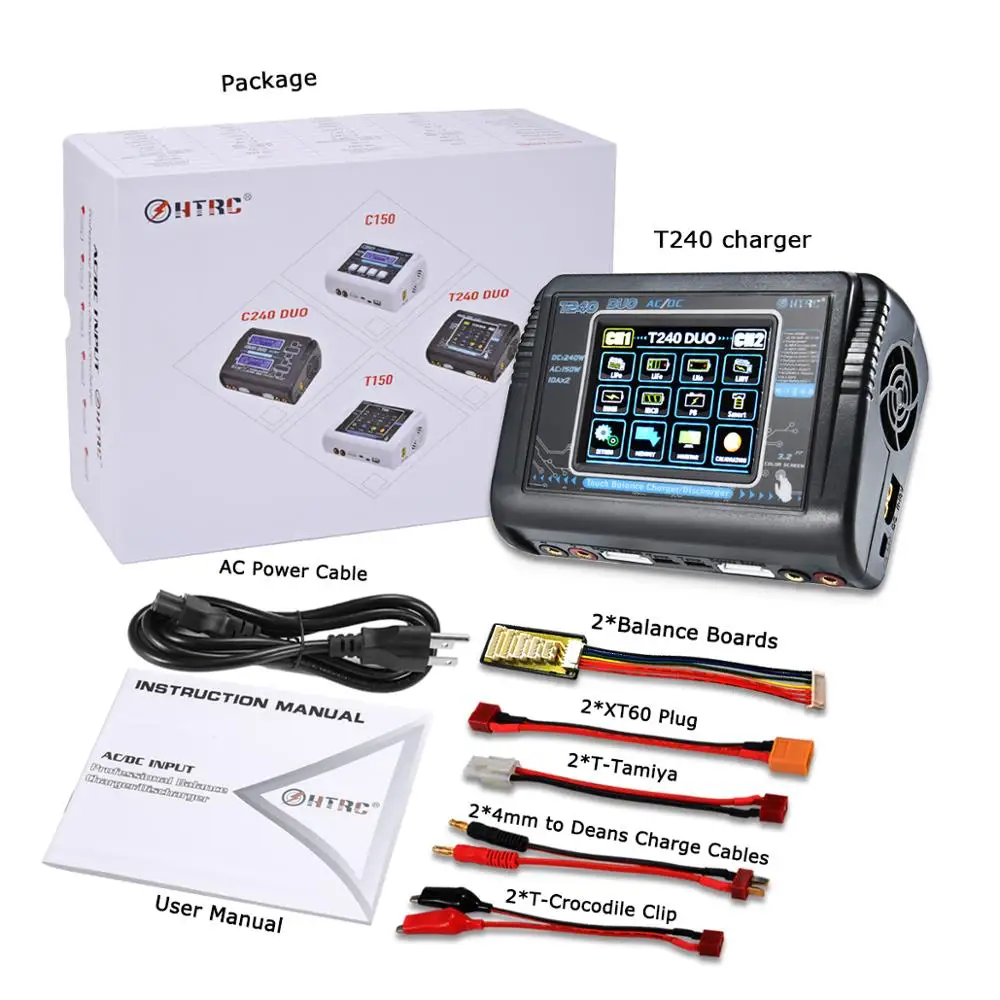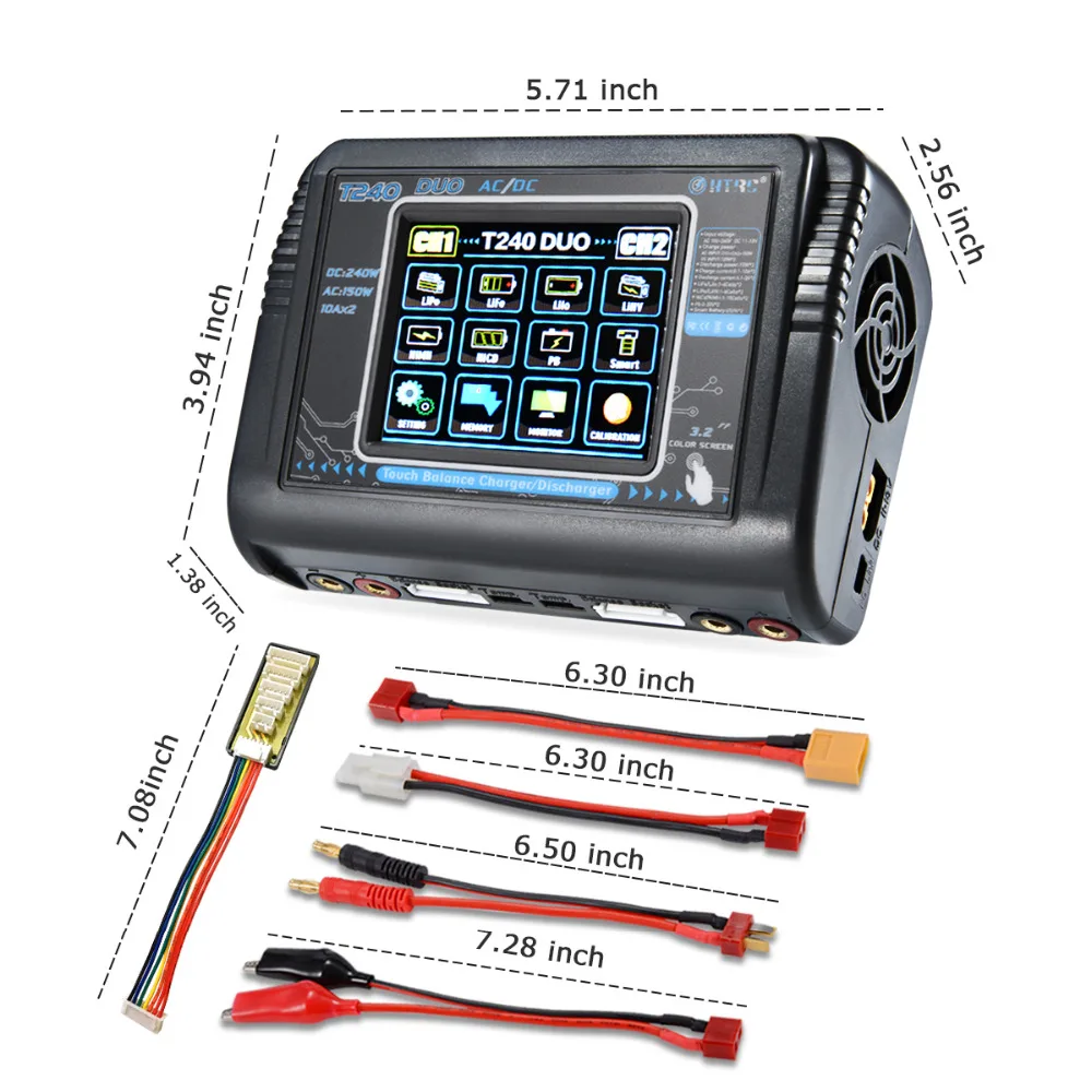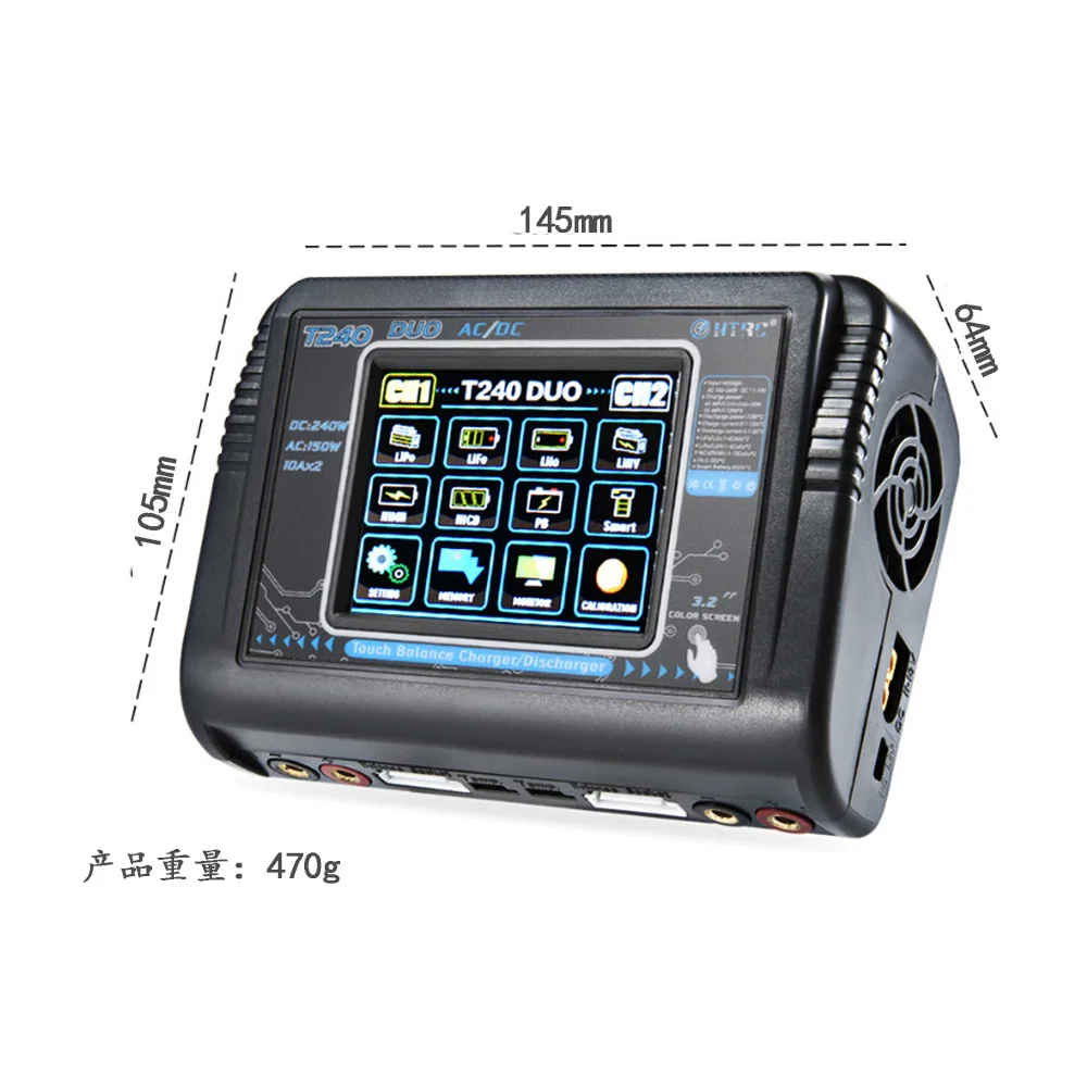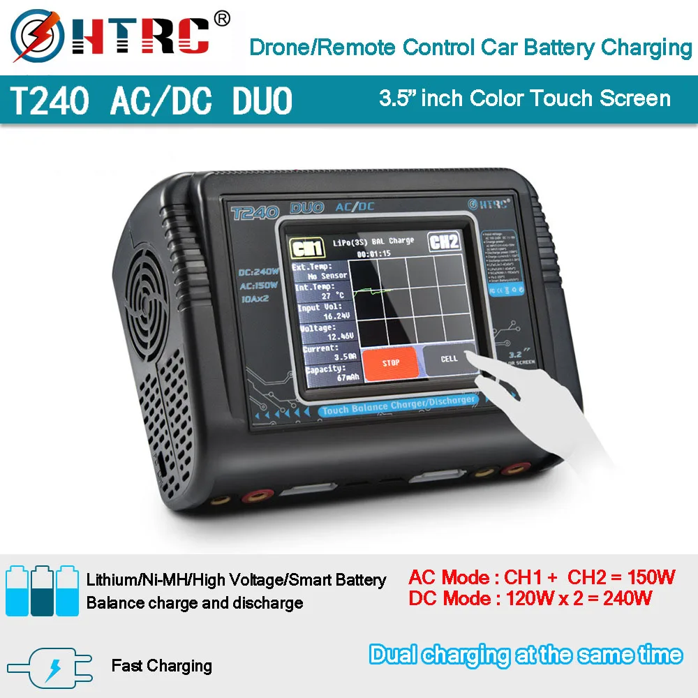 Зарядное устройство HTRC T240 Lipo, Двухканальное, 3,5 дюйма, с цветным сенсорным экраном, балансирующее зарядное устройство Dis, зарядное устройство AC 150W DC 240W C150 T150 для радиоуправляемого режима