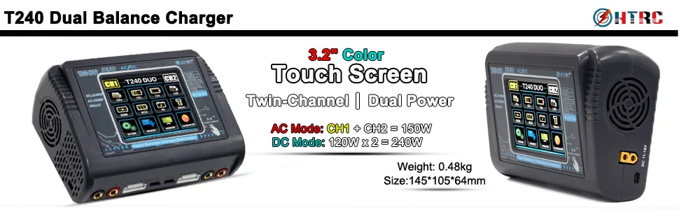 T240-это новое дизайнерское двойное зарядное устройство HTRC, которое может заряжать два разных типа батарей одновременно. Многофункциональный, высокая мощность, использование 3,2 дюйма цвет ЖК-дисплей Toch экран дисплея, легкая работа, встроенный вентилятор охлаждения, DC 11-18V или AC 100-240 В двойная мощность. Предназначен для зарядки аккумуляторов LiPo LiFe Lilon LiHV NiCd NiMh Pb Smart.Он может поддерживать распределение мощности в режиме переменного тока, общая мощность 150 Вт (CH1 + CH2 = 150 Вт). И в режиме постоянного тока, работает в 2*120 Вт. Максимальный ток заряда может достигать 10А каждого порта в режиме переменного и постоянного тока.