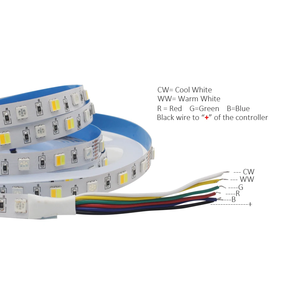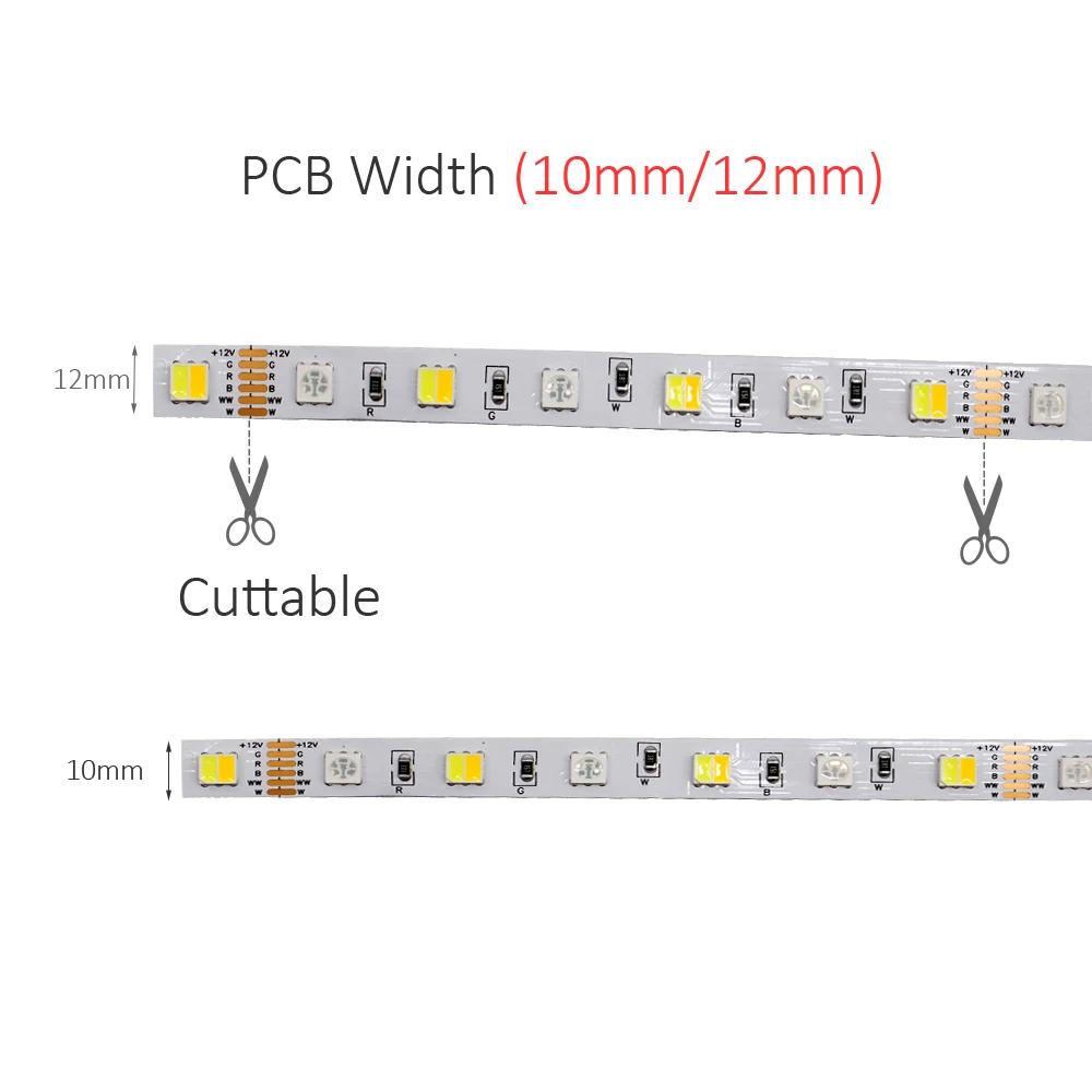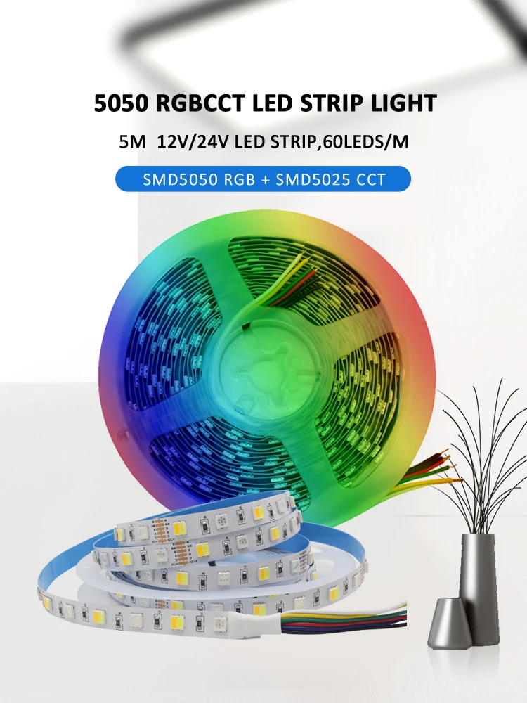 Светодиодный Тип: 5050 SMD светодиодныйКоличество: 5 м 300 светодиодов или 60 светодиодов/мСветодиодный цвет: RGBCCT ( RGB + WW + CW)Угол обзора: 120 °Рабочее напряжение: DC12V / DC24VРабочая температура: -20 ° ~ 60 °Мощность: <60 ВтДлительный срок службы:> 100000 часовУровень водонепроницаемости: IP65 Силиконовый водонепроницаемый, IP20 не водонепроницаемый, IP67 водонепроницаемыйШирина печатной платы: 10 мм/12 мм опциональноПосылка: 5 м/рулон