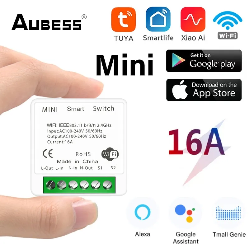 Умный Wi-Fi переключатель Aubess Tuya, 16 А, беспроводной переключатель для умного дома с таймером и голосовым управлением, Модуль Автоматизации сделай сам