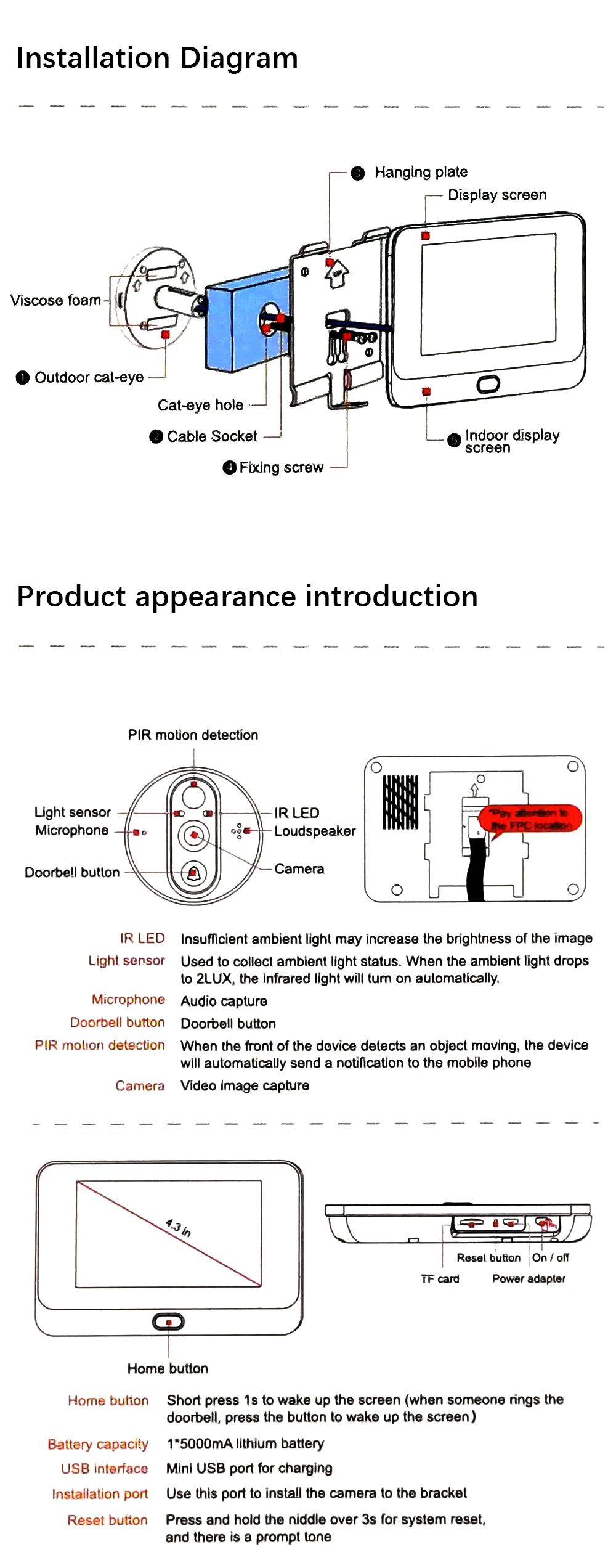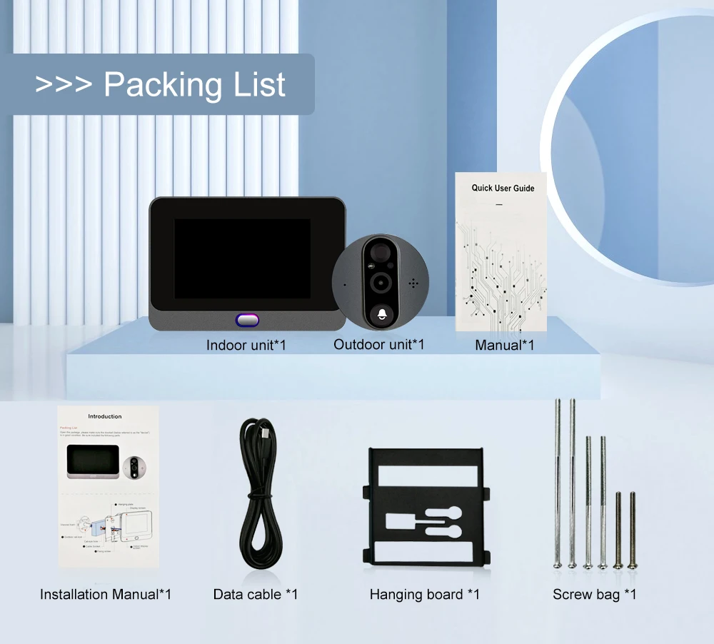 ◆Умные домашние устройства отличаются от традиционных устройств. Многие функции устанавливаются через мобильный телефон. Более продвинутые.1. Не включая sd-карту (можно приобрести отдельно), видео может храниться в памяти телефона.2. Установите различные функции через мобильное приложение вместо установки на внутреннем мониторе.3. Домофон с посетителем на мобильный телефон, и посетитель непосредственно разговаривает через внешний блок. Вместо использования внутреннего блока, чтобы поговорить с посетителями4. Загрузите приложение Tuya на свой мобильный телефон.Другие:1. Функция обнаружения движения может регулировать чувствительность, может делать скриншоты вместо сохранения видео. Из-за проблемы кэширования сети, это может быть задержано на несколько секунд.2. Для защиты срока службы оборудования, будет задержка на несколько секунд при запуске. Это нормальное явление защиты электронных продуктов.
