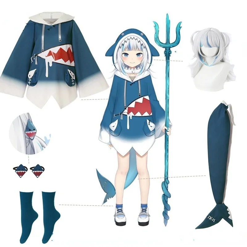 Hololive Gawr Gura/карнавальный костюм для женщин; Костюм акулы для женщин; Рождественский комплект для костюмированной вечеринки; Туфли с хвостиком; Парики Gawr Gura