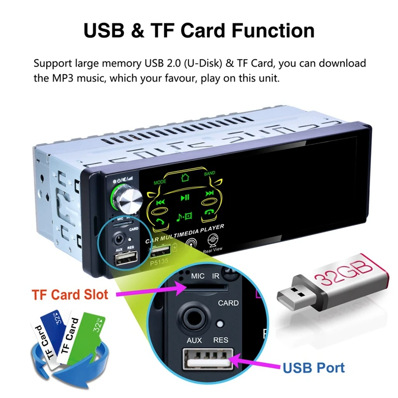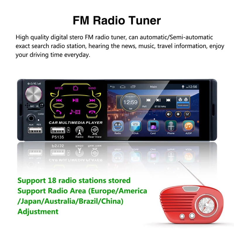 Автомагнитола P5135 1 Din, MP5-плеер с контактным экраном, 2USB, FM, AM, Bluetooth, Авторадио 4,1 дюйма, автомобильная стереосистема