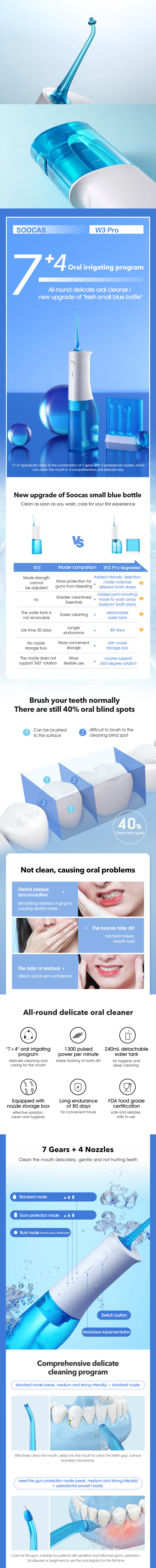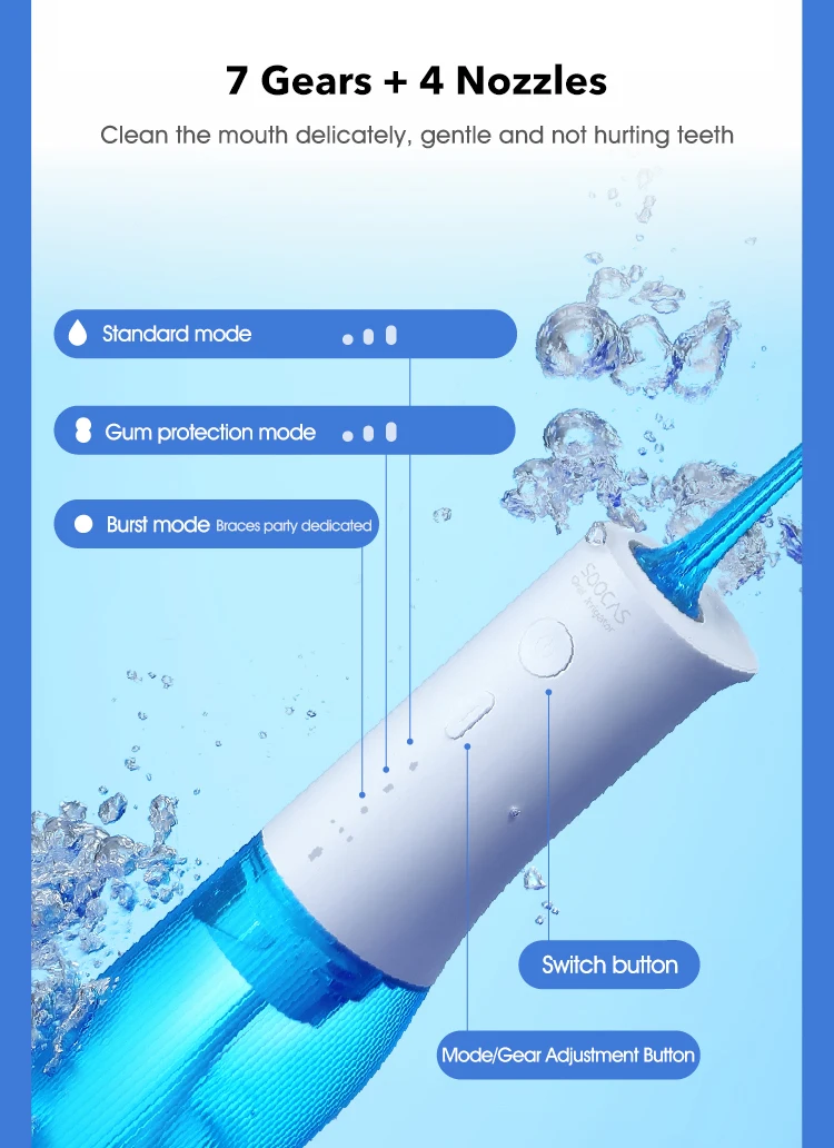 ● SOOCAS W3 power flosser water jet обеспечивает давление воды от 30-130 psi с 1400 импульсами в минуту.