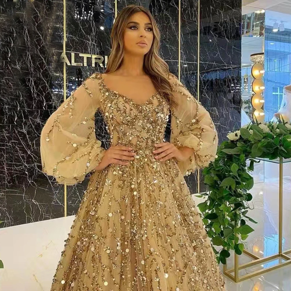 Роскошное платье для выпускного вечера с золотыми блестками и бусинами с пышными рукавами, а-силуэт, вечернее платье для мусульманской вечеринки, бальное платье Дубая, вечернее платье