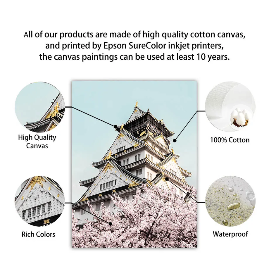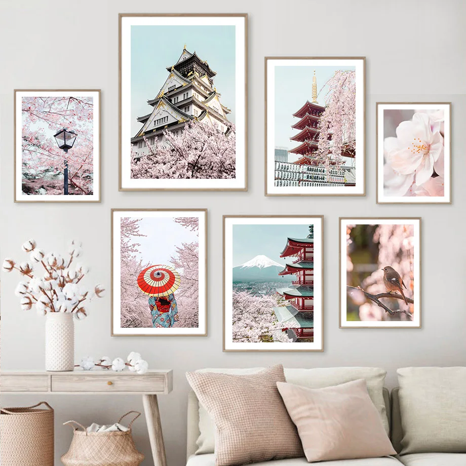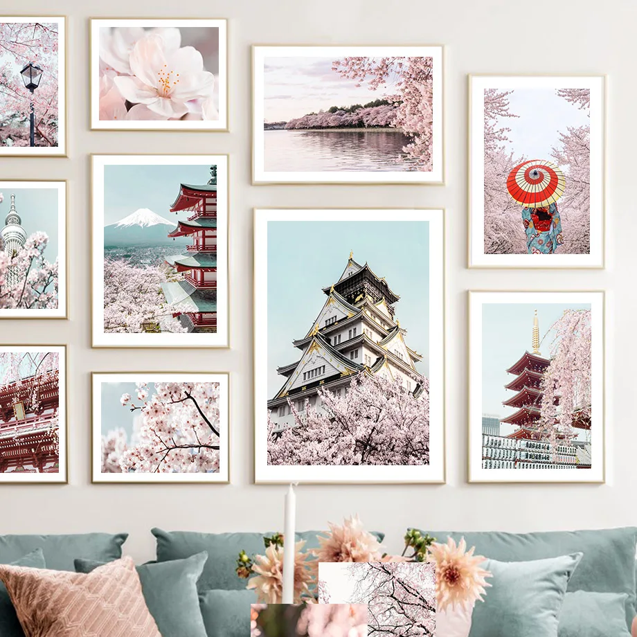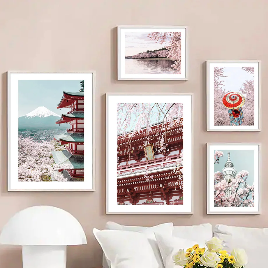 Настенная картина розового цвета с креплением сакуры Fuji, здание в Токио, настенная Картина на холсте, скандинавские плакаты и принты, настенные картины для декора гостиной