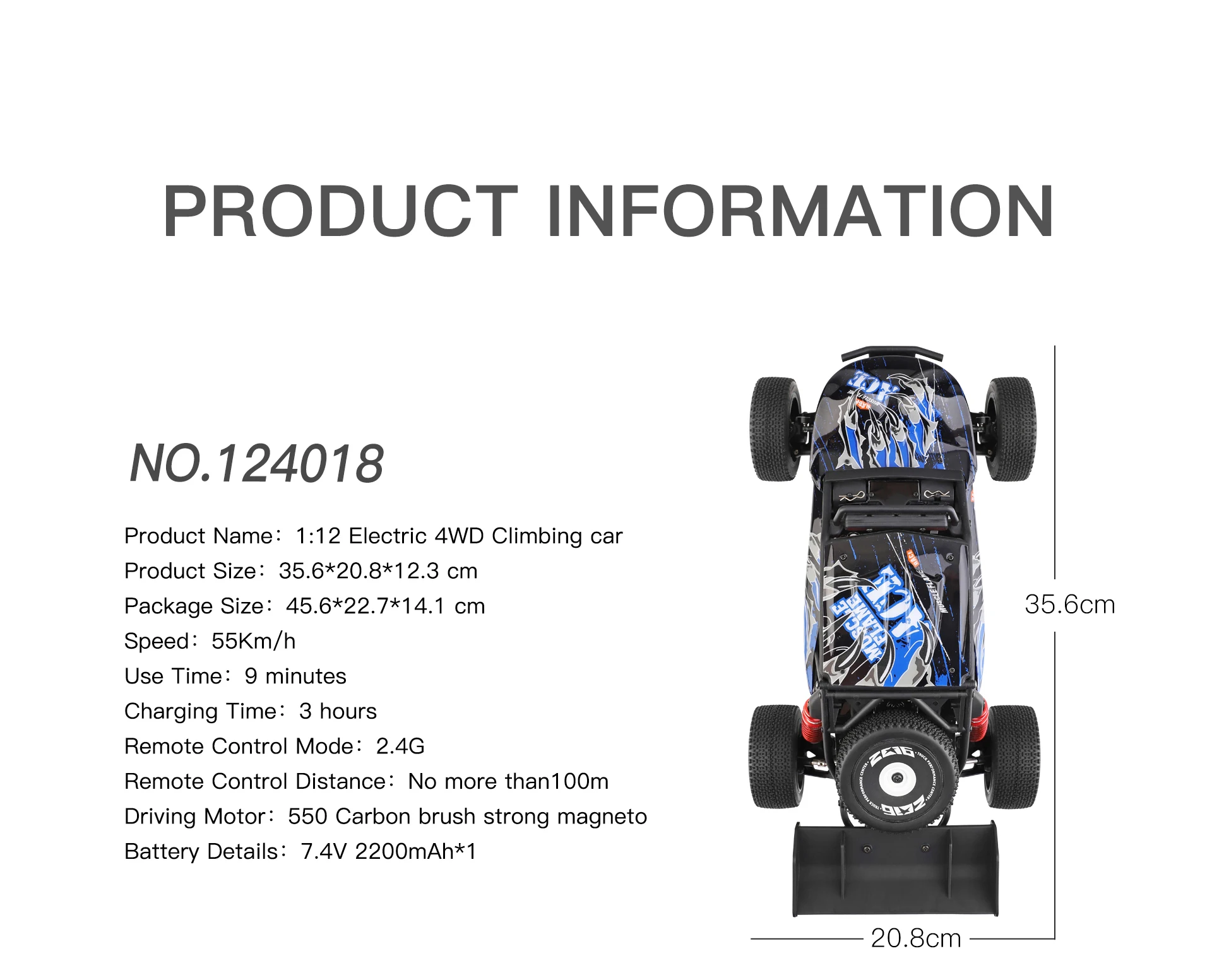 NO.104001Название продукта: 1:10 электрический автомобиль для скалолазания 4WDПродукт Размеры: 40,2*25,5*16,2 смРазмер посылка: 47,5*27,5*14 смСкорость: 45 км/чВремя использования: 7 минутВремя зарядки: 3 часаРежим дистанционного управления: 2,4GРасстояние дистанционного управления: не более 100 мМотор для вождения: 550 углеродная щетка с сильным магнитомДетали аккумулятора: 7,4 В 2200 мАч * 1